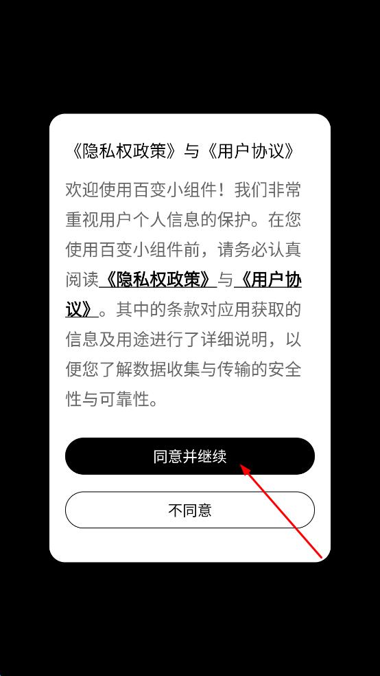 1、打开百变小组件App,弹出隐私权政策与用户协议提示框,仔细阅读后点击“同意并继续”,进入到应用主界面。