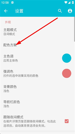 3、在设置页面,点击配色方案,进入配色方案选择页面。