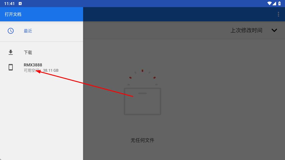 2、在文件选择界面左侧导航栏,点击标注可用空间38.11GB的RMX3888存储设备,进入下载目录。
