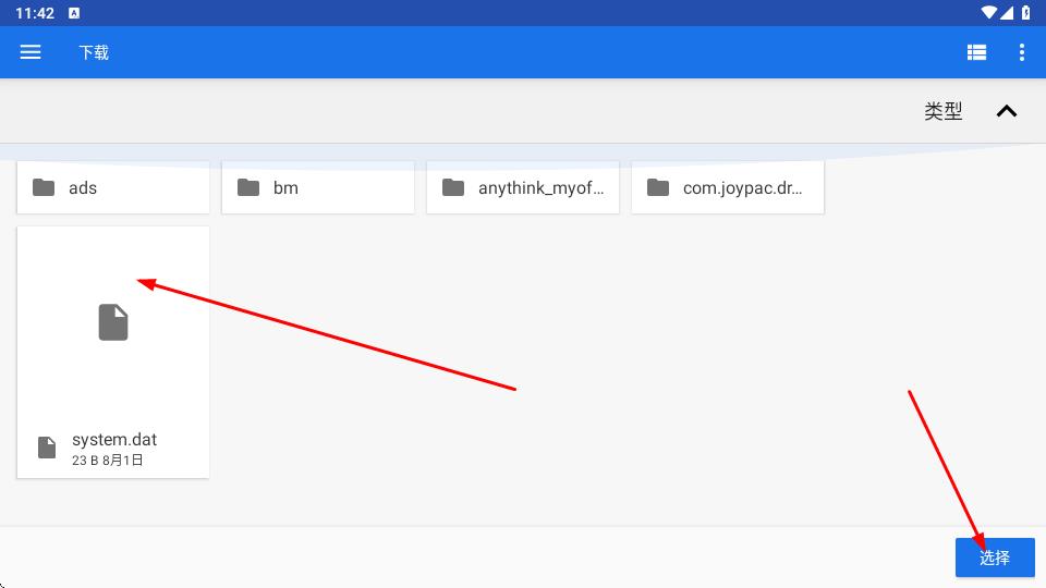 3、在下载目录中,选中名为system.dat的文件大小23B,修改时间为8月1),点击界面右下角蓝色选择按钮,完成文件选取操作。