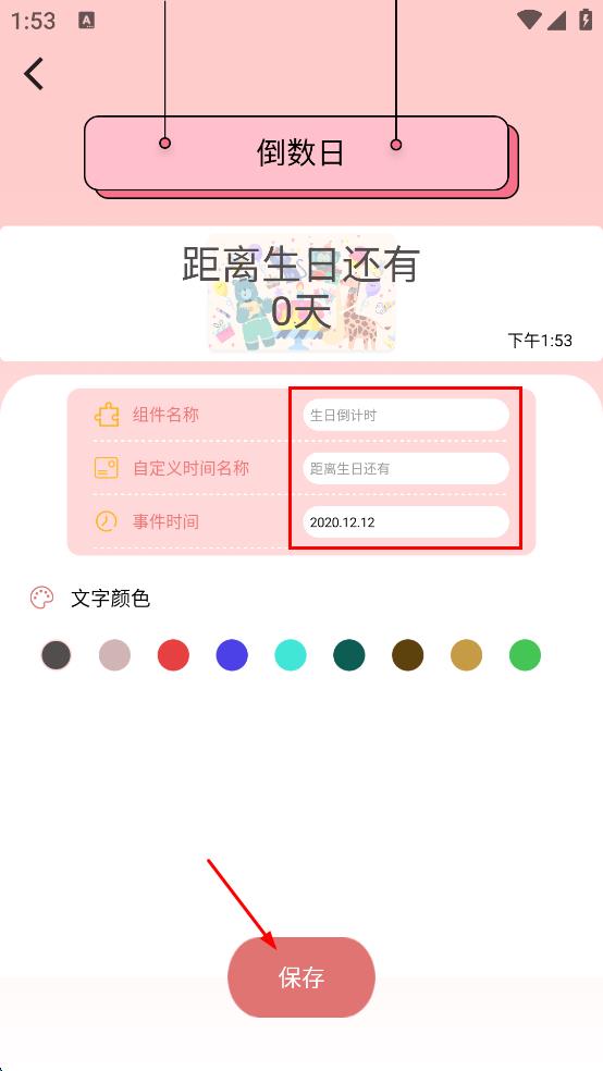 3、在倒数日组件设置页面,设置好组件名称、自定义时间名称以及事件时间等内容,然后点击下方“保存”按钮,即可完成桌面倒数日组件的设置。
