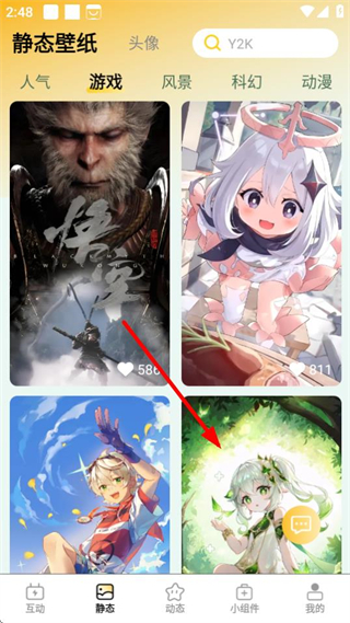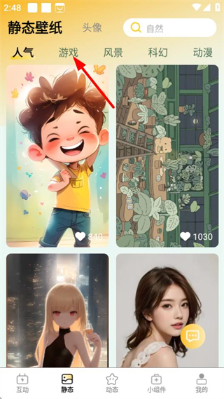 2、在静态壁纸页面,点击游戏分类,切换至游戏类静态壁纸内容。
