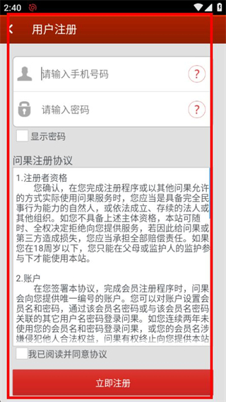 4、在用户注册页面,填写信息并勾选协议后,点击立即注册即可完成注册。