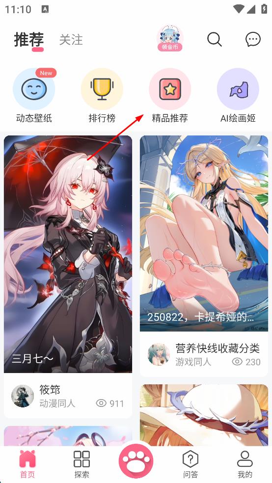 1、打开壁纸软件,进入后在页面上方找到选项,点击“精品推荐”选项,进入到精品推荐页面,浏览该页面中的壁纸。