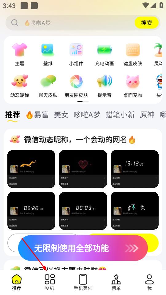 1、打开万能壁纸,点击页面底部的壁纸,进入壁纸页面。