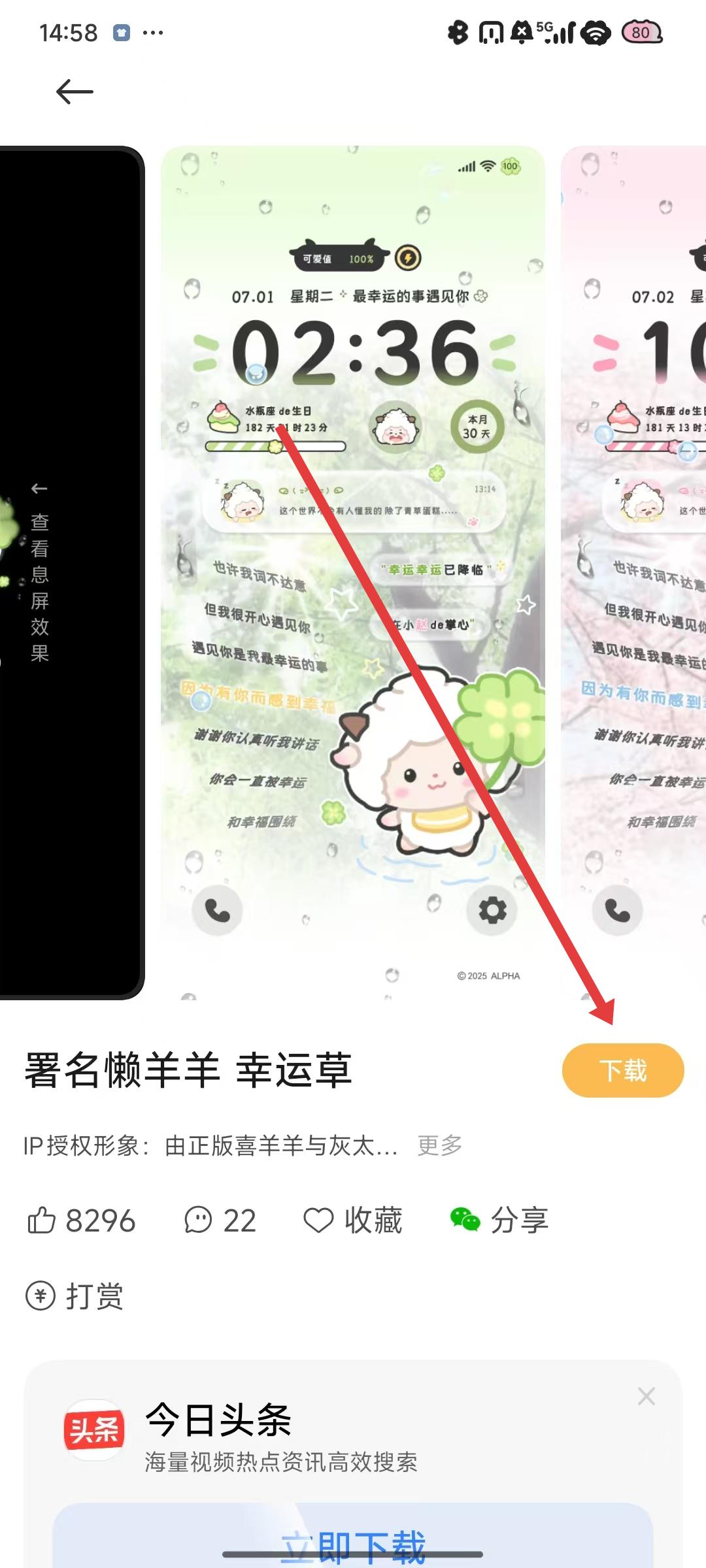 2、点击进入心仪主题的详情页面,查看主题的具体样式,确认喜欢后点击页面右下角的下载按钮。
