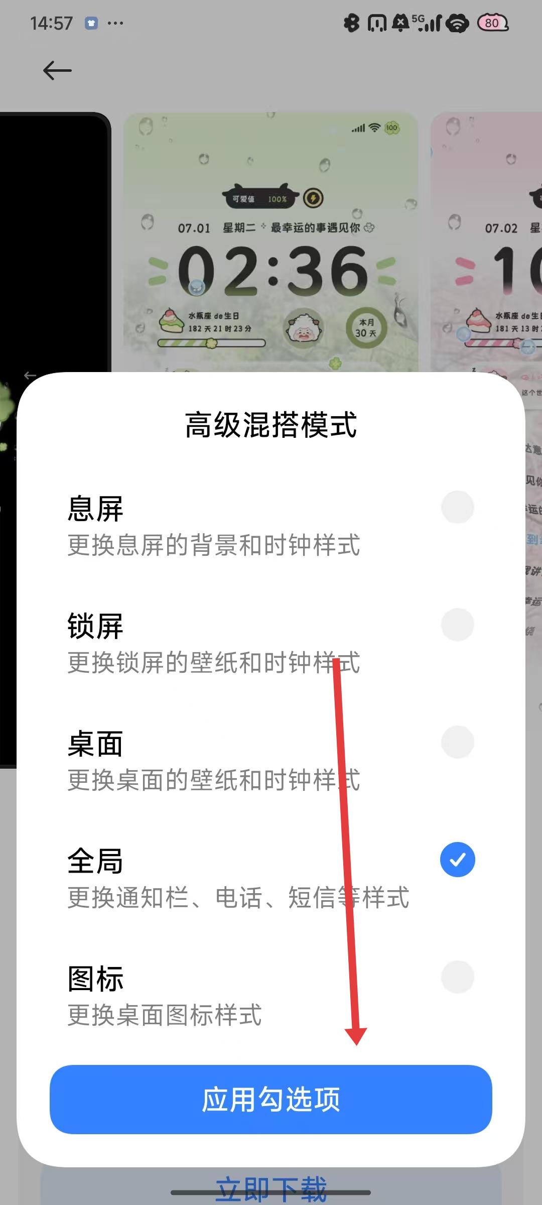 3、下载完成后,若出现高级混搭模式弹窗,可按需勾选息屏、锁屏等选项,最后点击应用勾选项即可完成主题设置。