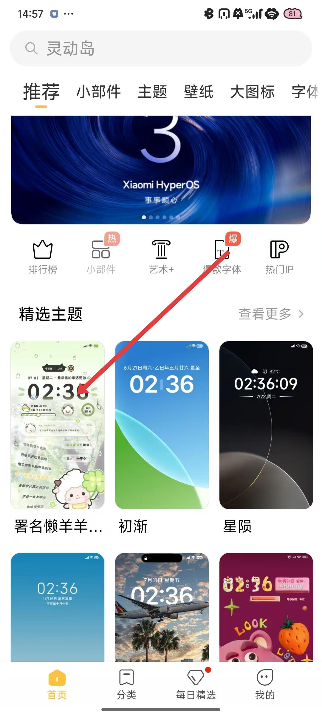 1、打开小米手机的主题壁纸应用,在推荐页面的精选主题板块,浏览并找到如署名懒羊羊...等自己喜欢的主题。