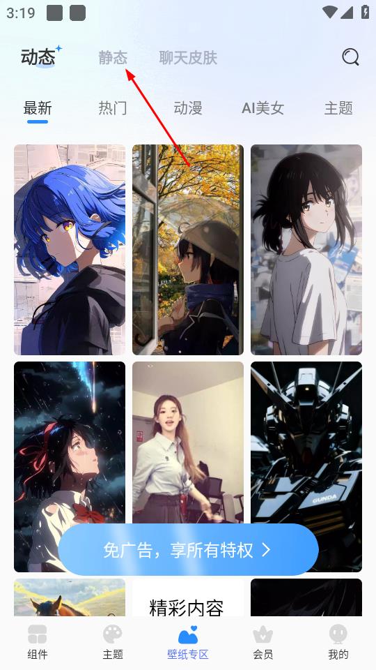 2、在壁纸专区页面,点击静态选项,查看静态壁纸。