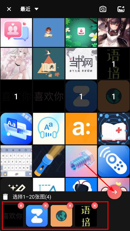 3、在图片选择页面,选择多张图片后,进入拼图编辑页面。