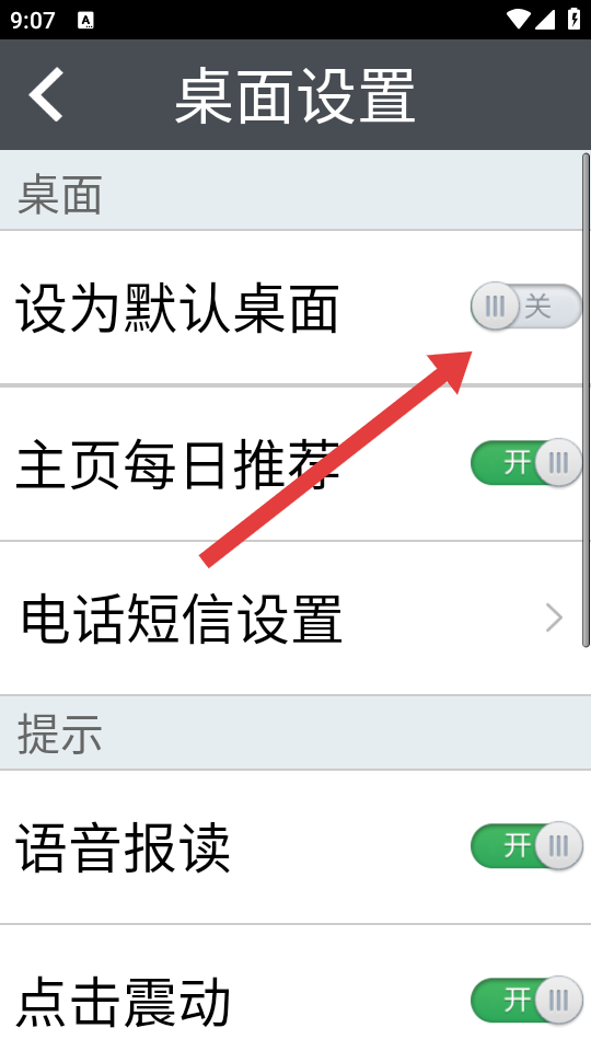 3、在桌面设置的页面,找到设为默认桌面选项,需要点击其右侧的开关。