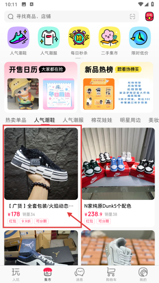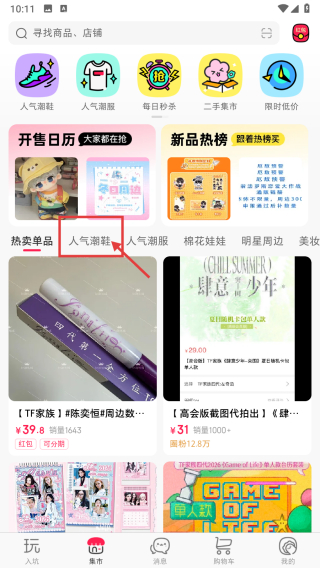 2、在集市页面,点击人气潮鞋选项,进入潮鞋商品列表页。