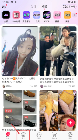 1、打开购物类APP,点击底部集市选项,进入集市页面。