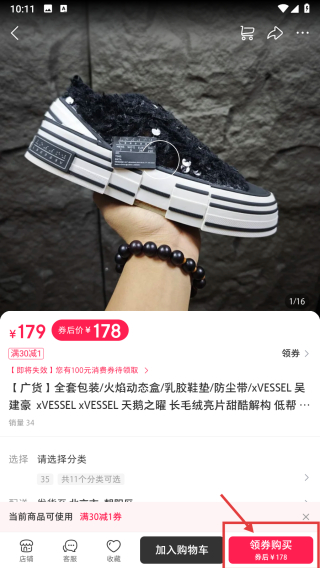 4、在商品详情页,点击领券购买按钮,进行该款鞋子的购买操作。