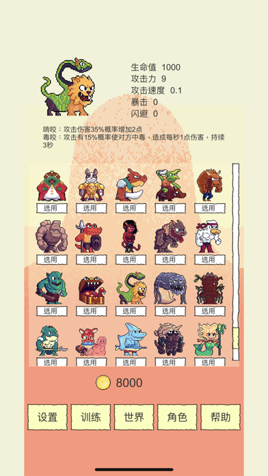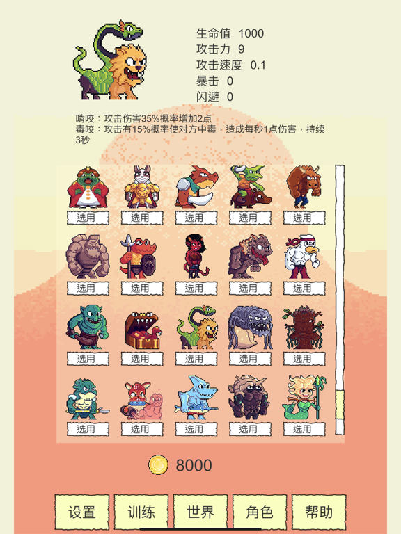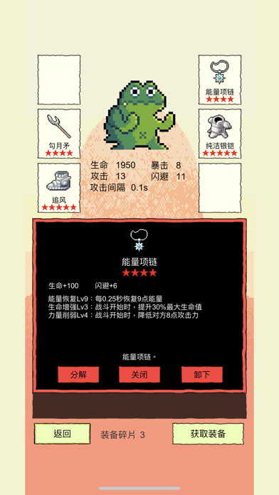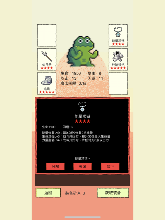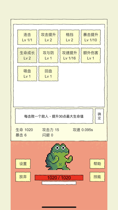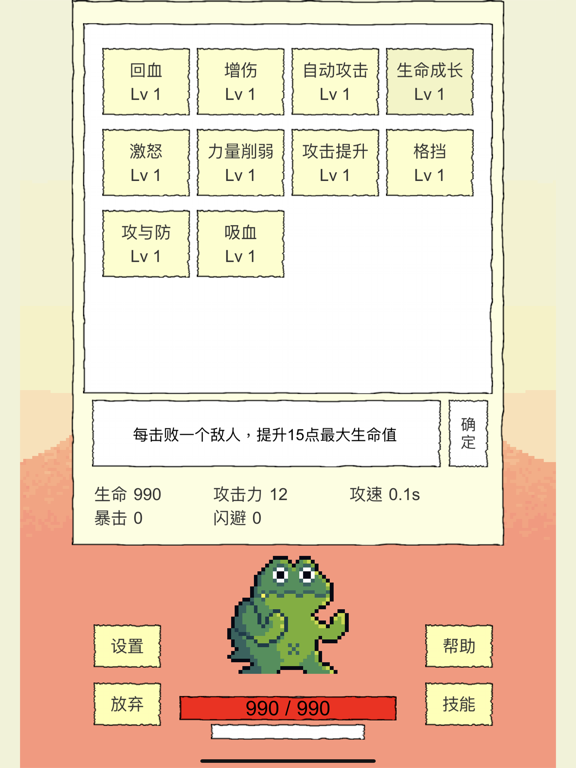 Rougelike选技能闯关 130+独立技能 每次从3个随机技能选择一个 来得到拥有不同技能的独特角色 技能效果可无限叠加 新增:众多独具特色的装备!1.重大调整!现在闪避将不会完全闪掉攻击,而是将攻击伤害降为1。因此那些攻击后触发和被攻击后触发的技能将更多的发挥作用了 2.新增技能[生命溢击]:每当累积回复足100血量时,对对方造成20点伤害 3.修复一点小bug 4.其他一些小优化