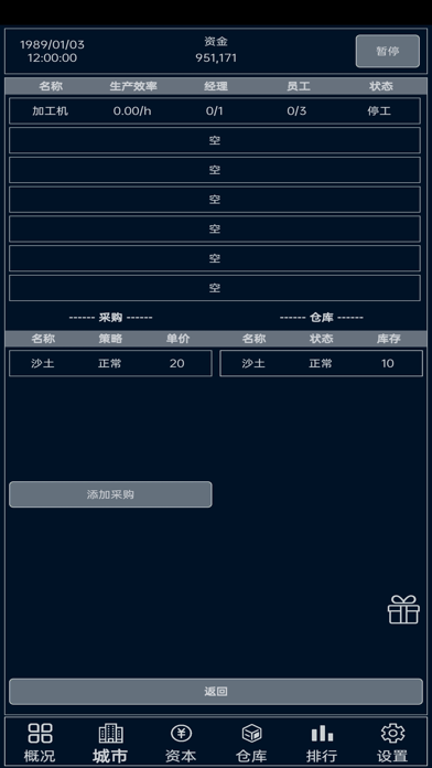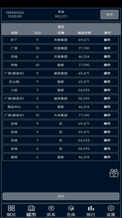 管理一家公司 自由度高的一款文字游戏 在游戏中您可以 买卖地皮,采矿,生产,批发,零售,等一系列骚操作优化收购流程 修复收购后卡时间的问题 优化存档大小 修复暴乱逻辑 优化仓库刷新 提高星球效率 提高星球开采效率 提高未知星球发现几率 优化AI采购逻辑