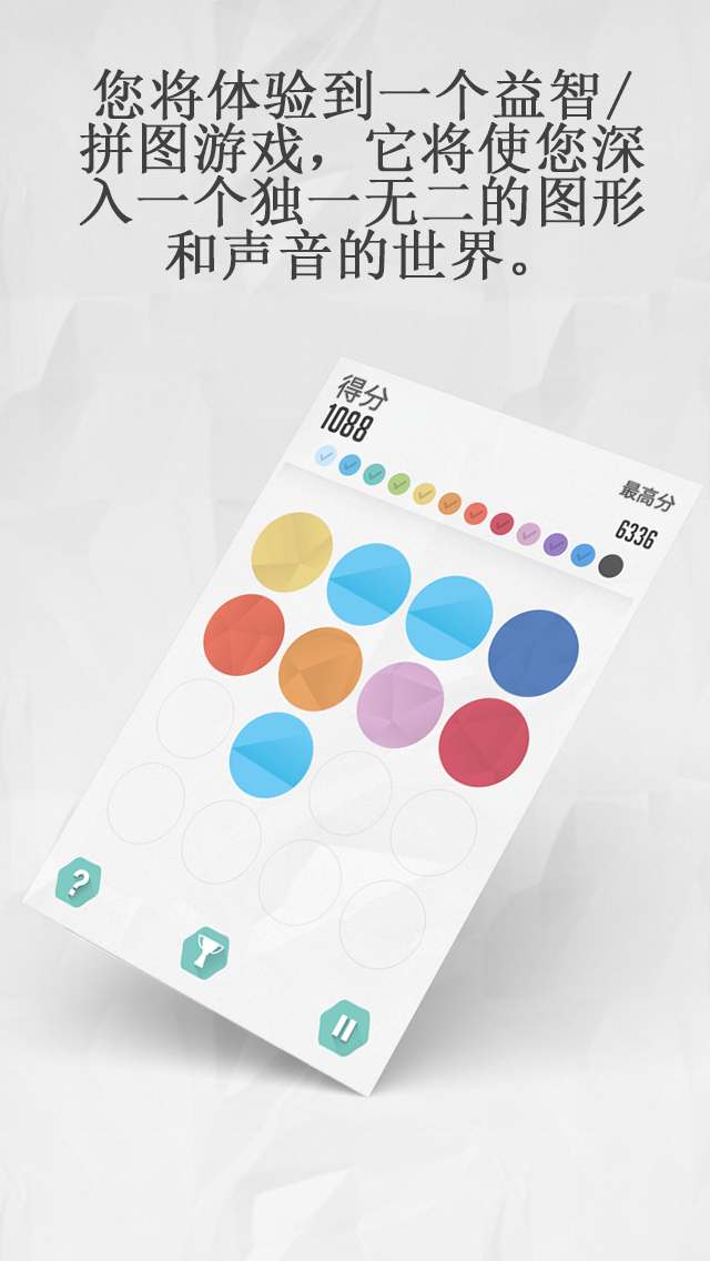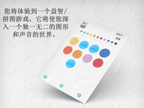 伴随 彩色气泡,您将体验到一个益智/拼图游戏,它将使您深入一个独一无二的图形和声音的世界。 滑动您的手指以便移动屏幕上出现的各种色块。当两个色块发生接触时,它们将创造一个新的色块,您将因此而得分。 请尽可能多的找出各种色块,完成它们的合并并不断提高您的得分。 您可在脸谱网、推特网和游戏中心中分享您的表现,从而与您的亲朋好友共同体验这一高雅、精妙的视频游戏并挑战您的朋友及来自全世界的玩家。 Facebook : https://www.facebook.com/pages/Cazzual-Games/828515947159864 Twitter : https://twitter.com/CazzualGames Email : contact-appstore@cazzualgames.com - 如果你听音乐的音乐自动关闭。音乐也可以关闭或打开在设置菜单 - 修复小错误且提升稳定性