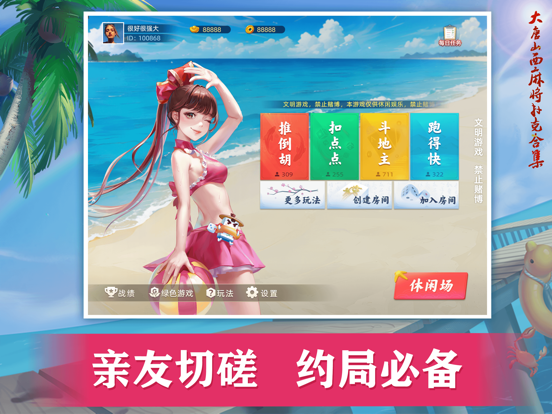 一款主打家人朋友之间消遣娱乐、线上组局的免费游戏。 游戏特色: 1、玩法非常丰富,包括推倒胡麻将、抠点麻将、拐三角麻将、晋中麻将、立四麻将、运城麻将、榆林打锅子、长治124、稷山扭叶子等麻将玩法和斗地主、跑得快、临汾斗地主等大众扑克玩法。麻将扑克一款app全都有,想玩哪个玩哪个! 2、每日任务奖励丰厚、免费畅玩停不下来。 3、创新的二人推倒胡、二人跑得快等二人玩法,只需二人就可开局,解决您人数不足不能游戏的烦恼。 4、金币场一人即可匹配对战,全真人匹配,切磋牌技,随时随地,想玩就玩!1.增加游戏加载进度条的百分比显示。 2.游戏引擎升级,提供更流畅的游戏体验。 3.修复部分已知bug。