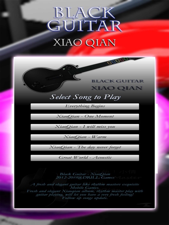 一款清新淡雅的类似吉他节奏大师的精致手游。 纷繁复杂的生活需要一股清流,一款完全让你放松的游戏,耳目一新的游戏。 小倩音乐清新脱俗,用节奏大师的玩法加吉他的弹唱,一定会让你有一种非常清新的感觉! 后续歌曲不断更新中fix bugs upgrade are content