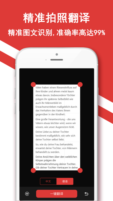 《德语翻译官》专业德语翻译软件,地道德文翻译,高效拍照翻译,智能语音翻译,即时对话翻译,依托人工智能黑科技,德国旅行德语学习随身必备神器! 【核心功能】 德语翻译:接入德国本土标准德语,地道德文翻译。 拍照翻译:德文拍照翻译,精准德语图文识别,随拍随译! 语音翻译:极速国人语音识别,不卡顿识别准,边说边译! 对话翻译:德国旅行即时对话翻译,走遍德国必备翻译助手! 【功能补充】 1,德语学习特色有声节目 2,翻译字体大小自行调控 3,拍照翻译支持只能分段 4,翻译内容收藏,随身翻看 5,德语字母发音表、音标发音 6,德语日常口语、旅行常用语 更多功能等你发现,快来下载试试吧 【自动续费VIP套餐说明】 - 订阅周期:12个月/年VIP会员(连续包年)。 - 订阅价格:连续包年价格为每年98元。 - 订阅付款:自动续费商品“连续包年”,用户确认购买并支付后记入iTunes账户。 - 订阅续费:您的会员到期前24小时,苹果公司会自动为您从 iTunes账户扣费,成功后有效期自动延长一个周期,如您未取消订阅,苹果公司会在扣费期内不定期尝试扣款,请及时关注订阅及扣款情况。 - 取消续费:若需取消自动续费,请在当前订阅周期到期前24小时,进行取消操作。 - 取消方法:您使用苹果ID开通的自动续费产品,在“设置” - “iTunes Store与App Store” - “Apple ID” - “查看Apple ID” - 在账户设置页面点击“订阅” - 取消德语翻译官自动续费VIP订阅即可。 - 隐私协议:http://www.528529.com/apphtml/1419959839_ys_cn.html - 服务协议:http://www.528529.com/apphtml/1419959839_tk_cn.html 【联系我们】 如有任何问题欢迎撩骚,您的建议和反馈,是我们产品改进的巨大动力,感谢每一位使用产品支持我们的小伙伴们,我们一直在努力做到最好,加油~!合作和问题反馈联系邮箱:app20190304@qq.com1、升级支持离线翻译 2、升级支持自动检测语言 3、升级支持备份收藏记录 4、优化翻译接口,更稳定翻译 更多细节优化升级等你来体验