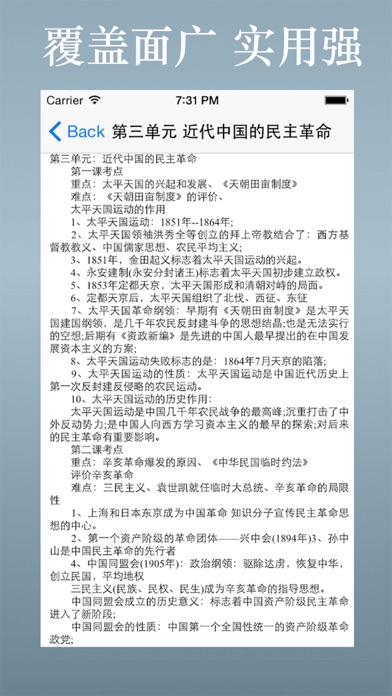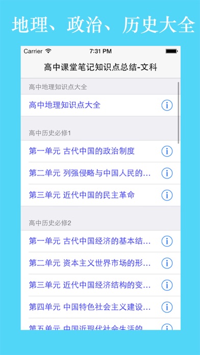 *****一个ios应用汇总高中文科:历史、政治、地理课堂笔记大全,省去记录课堂笔记的烦恼。 -----高中生期中考试、期末考试、会考、高考复习参考的好文档。 ----内容涵盖: 高中历史 ====必修1 1.第一单元:古代中国的政治制度 2.第二单元:列强侵略与中国人民的反抗斗争 3.第三单元:近代中国的民主革命 ====必修2 4.第一单元 古代中国经济的基本结构与特点 5.第二单元 资本主义世界市场的形成和发展 6.第三单元 近代中国经济结构的变动与资本主义的曲折发展 7.第四单元 中国特色社会主义建设的道路 8.第五单元 中国近现代社会生活的变迁 9.第六单元 世界资本主义经济政策的调整 10.第七单元 苏联的社会主义建设 11.第八单元 世界经济的全球化趋势 ====必修3 12.第一单元 中国传统文化主流思想的演变 13.第二单元 西方人文精神的起源及其发展 14.第三单元 古代中国的科学技术与文学艺术 15.第四单元 近代以来世界的科学发展历程 16.第五单元 近代中国的思想解放潮流 17.第六单元 20世纪以来中国重大思想理论成果 18.第七单元 现代中国的科技、教育与文学艺术 19.第八单元 19世纪以来的世界文学艺术 高中政治 ===高中政治必背知识点 1.经济生活 2.哲学原理及方法论 3.认识论和实践论 4.人生观和价值观 5.学业水平测试(政治生活)复习题 =====高中政治必修一知识点 6.第一单元、生活与消费 7.第二单元、生产、劳动与经营 8.第三单元、收入与分配 9.第四单元 发展社会主义市场经济 =====高中政治必修二知识点 10.高中政治必修二~第一单元 11.高中政治必修二~第二单元 12.高中政治必修二~第三单元 13.高中政治必修二~第四单元 =====高中政治必修三知识点 14.第一课 文化与社会 15.第二课 文化对人的影响 16.第三课 文化的多样性与文化传播 17.第四课 文化的继承性与文化发展 18.第五课 文化创新 19.第六课 我们的中华文化 20.第七课 我们的民族精神 21.第八课 走进文化生活支持 iOS 18; 丰富更多内容;