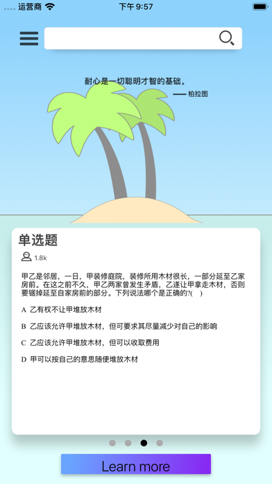 法律职业资格考试每日练,使用简单,题库内容丰富,功能聚焦学习内容。欢迎您使用,为了让您获得更加理想的体验,我们会在App Store 中更新应用。每次应用更新都包含速度和稳定性的提升,有时会有新功能的推出,请您保持应用为最新版本。我们一直在进步!Enjoy it! 本次更新: 修复已知问题。