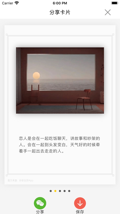好奇日历是一款轻阅读、轻学习的App。 每天打开一到两次,每次一分钟,跟自己的内心相处。 * 感悟一些人生道理 * 倾听一段美丽文字 * 偶尔来碗毒鸡汤,刺激心灵 * 回味那些电影中的美丽台词 * 一段情话绵绵、感受青春的美丽 * 每天一句英语句子,进步每一天 * 奇奇怪怪的冷知识、让你脱颖而出 * 健康小贴士、让你远离那些谣言 如果你想要的更多好奇的轻阅读内容,请跟我们分享。1.修改分享图片的二维码跳转问题