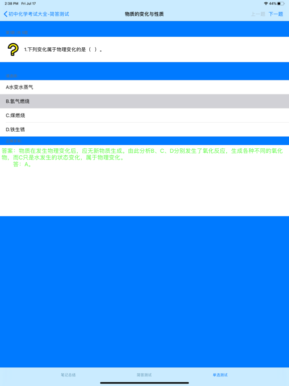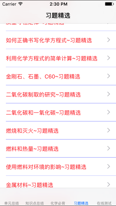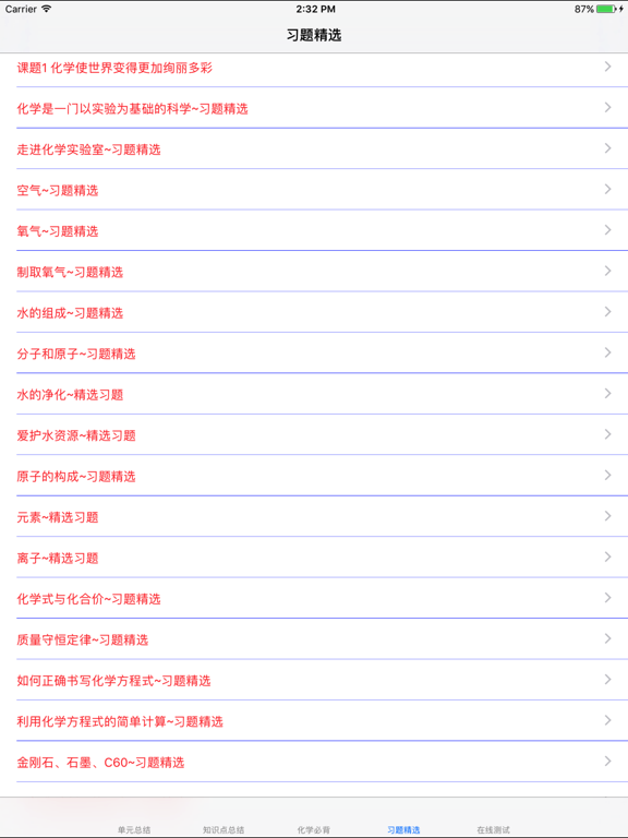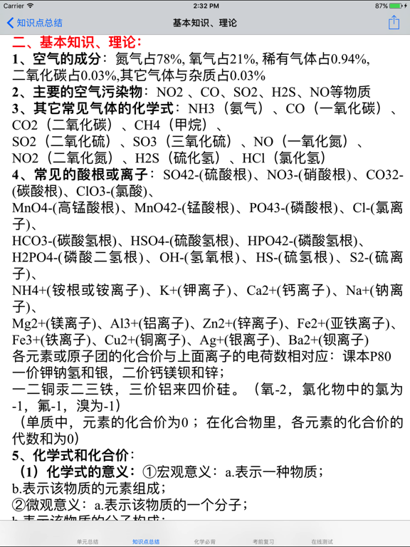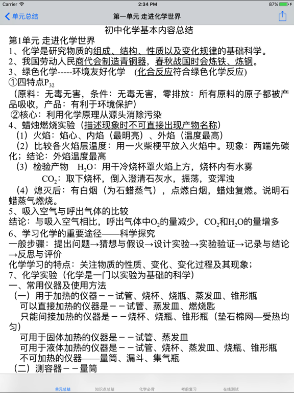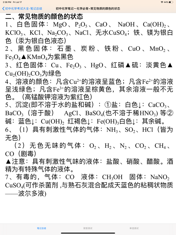 *****初中生化学学习的好助手,给力推荐《初中化学课堂笔记、知识点总结、习题精选大全》***** --初中化学各单元、章节知识点一应俱全; --为各章节配备了一课一练习题,十分适合自学、中考复习使用; 【内容涵盖:】 初中化学各单元知识点大全 1.绪言/第一单元 走进化学世界 2.第二单元 我们周围的空气 3.第三单元 自然界的水 4.第四单元 物质构成的奥秘 5.第五单元 化学方程式 6.第六单元 碳和碳的氧化物 7.第七单元 燃料及其应用 8.第八单元 金属和金属材料 9.第九单元 溶液 10.第十单元 酸和碱 11.第十一单元 盐 化肥 12.第十二单元 化学与生活 初中化学常用知识点总结大全 13.常见物质的化学式 14.常见物质的俗名 15.常见的化学方程式 16.常见反应的现象 17.常见物质的颜色、气味 18.多功能瓶 19.除杂质总结大全 20.化学中的鉴定总结大全 初中化学笔记大全 21.初中化学常见物质的性质和用途 22.初中化学常见物质的化学式 23.初中化学必需的记忆性知识 24.初中化学方程式按元素归类总结 25.常见生活中的化学知识 26.超级化学复习笔记-理论篇 27.超级化学复习笔记-规律篇 28.超级化学复习笔记-实验篇 29.超级化学复习笔记-计算篇 30.超级化学复习笔记-简答篇 初中化学习题精选一课一练 1.课题1 化学使世界变得更加绚丽多彩 习题精选 2.化学是一门以实验为基础的科学 习题精选(一、二) 3.走进化学实验室 习题精选(一、二) 4.空气 习题精选(一、二) 5.氧气 习题精选(一、二) 6.制取氧气 习题精选(一、二) 7.水的组成 习题精选(一、二、三) 8.分子和原子 习题精选(一、二) 9.水的净化 习题精选(一、二) 10.爱护水资源 习题精选(一、二、三) 11.原子的构成 习题精选(一、二、三) 12.元素 习题精选(一、二、三、四) 13.离子 习题精选(一) 14.化学式与化合价 习题精选(一、二、三) 15.质量守恒定律 习题精选(一、二、三) 16.如何正确书写化学方程式 习题精选(一、二、三) 17.利用化学方程式的简单计算 习题精选(一、二、三、四) 18.金刚石、石墨、C60 习题精选(一、二、三) 19.二氧化碳制取的研究 习题精选(一、二、三) 20.二氧化碳和一氧化碳 习题精选(一) 21.燃烧和灭火 习题精选(一、二) 22.燃料和热量 习题精选(一、二、三) 23.使用燃料对环境的影响 习题精选(一、二、三) 24.金属材料 习题精选(一、二、三) 25.金属的化学性质 习题精选(一、二、三) 26.金属材料的利用和保护 习题精选(一、二、三) 27.溶液的形成 习题精选(一、二、三) 28.溶解度 习题精选(一、二、三) 29.溶质的质量分数 习题精选(一、二、三、四) 30.常见的酸和碱 习题精选(一、二、三) 31.生活中常见的盐 习题精选(一、二、三、四) 32.化学肥料 习题精选(一、二、三、四) 33.人类重要的营养物质 习题精选(一、二、三、四) 34.化学元素与人体健康 习题精选(一、二、三) 35.有机合成材料 习题精选(一、二) !!!如果您对此类的App感兴趣,可以访问我们其他的更多科目相关应用。丰富更多实用内容
