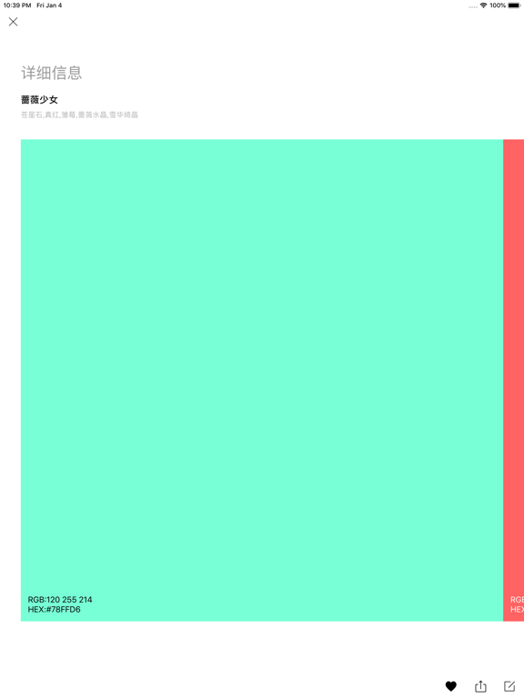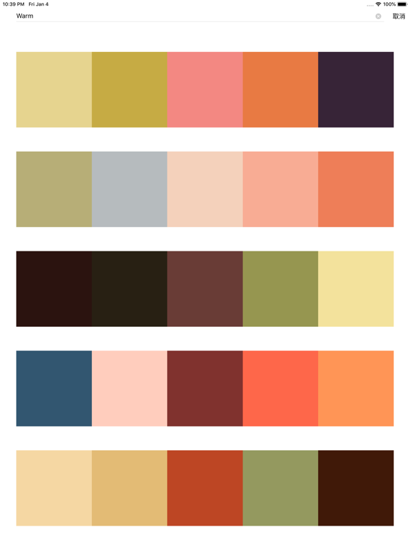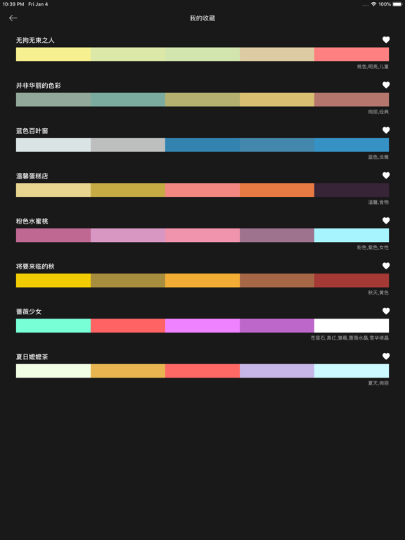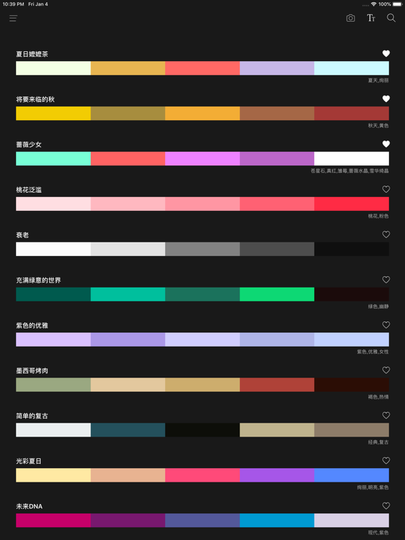 ※你的专业配色助理,最顺手的配色工具 1.上万种专业配色方案。 2.便捷的搜索,快速找到你想要的配色。 3.随时收藏,打造你专属的配色库。 4.通过照片和拍照获取图片的主要色值,形成自己的配色方案。 5.充分展示手机上的各种字体效果。1.修复了一些错误 2.提高了稳定性 为了让你获得更加理想的体验,每次app更新都包含速度和稳定性的提升