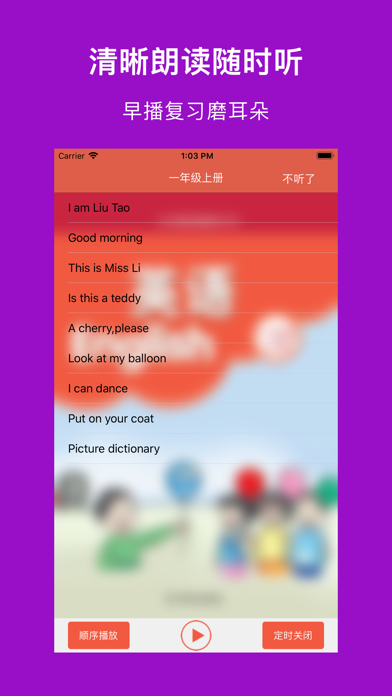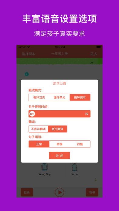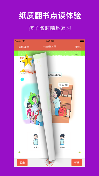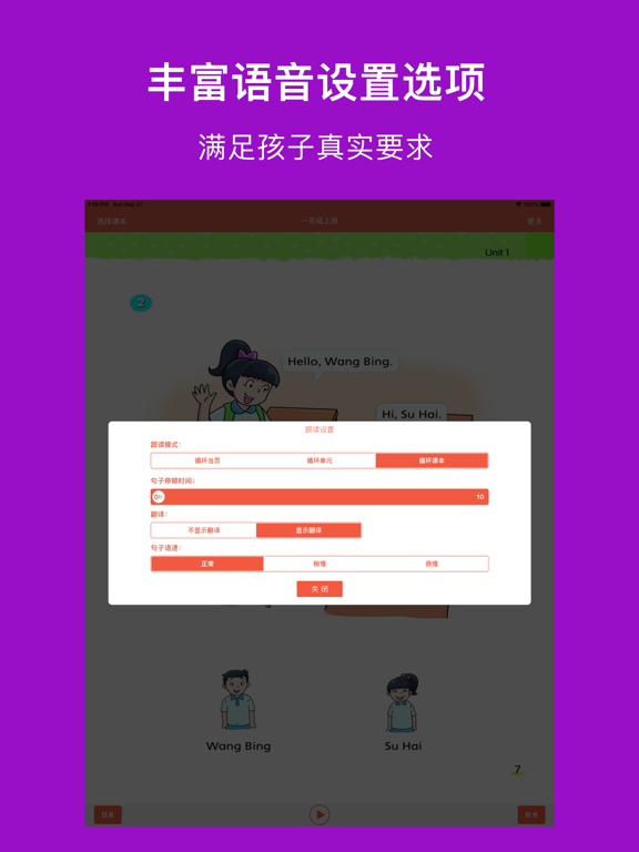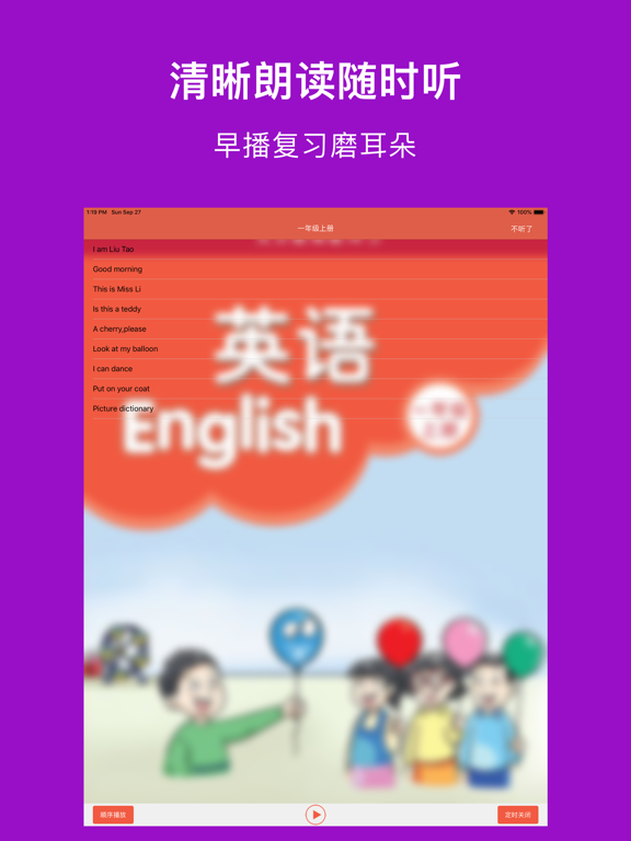* 适用全江苏小学英语一到六年级,共12套配套点读教材; * 高音质、高清晰、纯正标准,随时陪伴孩子读出来,易学易用很轻松; * 句子可翻译、语速可调,各种情况全满足; * 逐句录音,整页播放,制作自己的点读书本; * 学习进度,随时看,自动打分送鼓励; * 点读变听书,播放方式随意调 * 无广告。 【点读功能】 长按播放按钮,就能看到多个实用的跟读设置: 1、跟读模式:循环当页、循环单元、循环课本 2、句子语速:正常、稍慢、很慢 3、翻译开关 4、句子停顿时间 5、优先顺序:录音优先、原音优先 6、涂鸦:随书页显示涂鸦、不随书页显示涂鸦 【录音功能】 长按句子,提示录音: 1、双击句子,播放录音 【涂鸦功能】 点击画笔按钮,进入涂鸦状态: 1、色板:调整颜色、选择橡皮擦 2、清空:重新开始 3、截图:把手写效果保存本地,或者分享给其它人 【听书功能】 一下按钮,立马点读变听书,简单易用两设置: 1、播放方式:顺序播放、单曲循环、列表循环 2、定时关闭:自动停止朗读的时间,你来设定 希望【译小英语】APP的实用功能,可以帮您减轻陪孩子读书的烦恼。- 优化体验 ------------------------- 欢迎您加微信[vincela]给我们建议和支持,译小英语在您的支持下会越来越好用