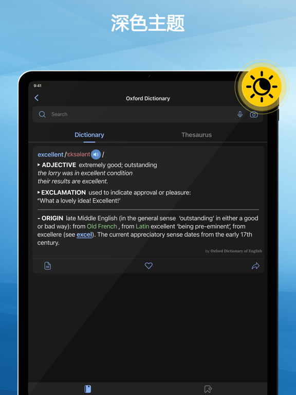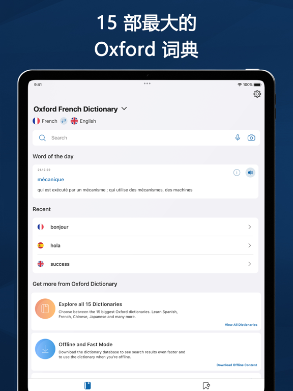 15 部最大的 Oxford 词典触手可及 由 Oxford Languages 提供支持,Oxford Dictionary 被广泛认为是当今语言研究和参考的最高权威之一。在 15 个最大的 Oxford 词典以及高级搜索和学习工具之间轻松切换和导航。 Oxford Dictionary of English & Thesaurus New Oxford American Dictionary & Thesaurus Oxford Hachette French Dictionary Oxford German Dictionary Oxford Spanish Dictionary Oxford Russian Dictionary Oxford Chinese Dictionary Oxford Paravia Italian Dictionary Oxford Hindi Dictionary Oxford English Urdu Dictionary Oxford Essential Portuguese Dictionary Oxford Japanese Mini Dictionary Oxford Greek Mini Dictionary Oxford Softpress English Bulgarian Minidictionary Concise Oxford-River Books English-Thai Dictionary Oxford Dictionary 对于在学术或专业环境中使用外语的任何人来说都是宝贵的资源: • 频繁使用英语的专业人士 • 准备 ACT、SAT、IELTS 或 TOEFL 考试的学生 • 学术人员 以及在工作或在家中需要全面而权威的词典的任何其他人。 来自英文权威机构的丰富内容 • 来自 Oxford Languages 的最新 2023 年单词数据库 • 超过 100 万单词、短语和定义 • 同义词词库 - 数以千计的同义词和反义词,可帮您区分相似词并正确使用它们 • 高品质的音频发音 • 专题参考内容 - 轻松查找专题内容 • 每日一词 - 每天学习一个新单词 用户友好的应用功能和界面 • 收藏夹列表 - 创建带有单词列表的自定义文件夹 • 最近列表 - 回顾已经查过的词 • 单词分享 - 轻松分享您刚刚学习的新单词或定义 • 主页 - 您的英语之旅的直观开始 • 自动更正选项 - 在您键入时更正单词拼写 • 深色主题 - 即使在光线较暗的环境中也能让您的眼睛放松并继续学习。 高级搜索选项 • 搜索自动完成 - 在您键入时显示预测 • 关键字查找 - 在复合词和短语中进行搜索 • 相机搜索 - 在相机取景器中查找单词 • 语音和模糊搜索 - 当您不知道单词拼写时进行查找 使用 PREMIUM 获得最大收益 发挥全球最佳词典的全部潜力: • 无限制使用词典 - 无限制访问超过 100 万个单词、短语和含义的最新数据库 • 音频发音 - 再也不会误读单词! • 离线和快速模式 - 随时随地访问丰富的单词数据库 - 无需数据连接或网络连接 • 定期内容更新 - Oxford Languages 有更新后,您就会收到单词数据库的更新 • 无广告 - 畅享无广告、无干扰的学习体验 定价和订阅 自动更新订阅条款: • 订阅按所选订阅计划的费率,每周、每月或每年计费。 • 每个订阅的价格对应的价格段,具体价格已在“Apple 的 App Store Matrix”中按各种其他货币列出 • 除非在订阅期结束前至少 24 小时关闭自动续订,否则您的订阅将自动续订 • 您可以随时在 App Store账户设置关闭自动续订,来取消订阅。此操作必须在订阅期结束前 24 小时完成,以免被收费。取消订阅将在当前订阅期最后一天的次日生效,届时您将被降为免费服务 隐私政策:https://mobilingo.ai/privacy-policy 使用条款:https://mobilingo.ai/terms-of-use在这个更新中,我们推出了一些令人兴奋的改进: * "每日单词"卡片的全新设计 * 现在您可以轻松地在词典之间切换并选择您喜欢的词典 * 数据库下载指示器得到了改进,变得更加用户友好和直观 * 错误修复和稳定性提升 喜欢这个应用吗?请给我们评分! 有建议吗?请通过support@agent.mobilingo.ai联系我们