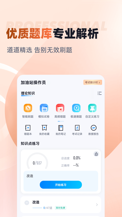 加油站操作员聚题库——专业备考 安全规范 助力油站作业认证 备战加油站操作员资格认证考试?加油站操作员聚题库是您专业可靠的备考助手。我们提供权威精准的练习资源,助您系统掌握加油站安全操作专业知识与技能,从容应对考试挑战。 真题模拟实战演练 应用内精选汇集历年考试真题及高质量模拟试卷,严格依据最新考试大纲与安全操作规程精心编写。通过模拟考试功能,您可体验真实考场环境,进行全真限时测试。考试结束后,系统即时生成详细分析报告,清晰展示您在油品知识、设备操作、安全管理、应急处置等各模块的掌握情况。智能评估系统精准定位知识薄弱环节,帮助您明确复习重点和改进方向。 系统化知识点练习 我们依据考试要求将知识点科学分类,涵盖油品特性与质量管理、加油机操作规程、储油罐安全知识、消防设施使用维护、防静电措施、油气回收原理、客户服务规范、突发事件应急处置、安全法律法规等核心内容。每个知识点模块都配有专项练习题和详细解析,帮助您深入理解加油站操作专业知识。您可以根据学习进度选择对应章节练习,巩固理论基础,掌握重点难点。 加油站操作员聚题库集权威真题模拟与系统知识点练习于一体,设计科学,操作便捷。通过反复的实战演练和针对性训练,帮助您夯实专业基础,提升安全操作技能。应用内容持续更新,紧跟最新安全规范和技术标准,是您备考复习、查漏补缺、提升通过率的专业工具。立即下载应用,开启高效备考之旅,为加油站操作员职业发展奠定坚实基础。优化已知问题 更新最新题库