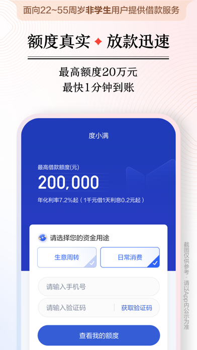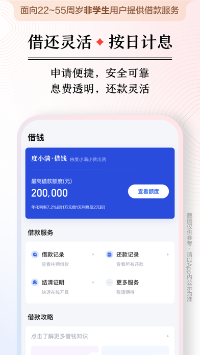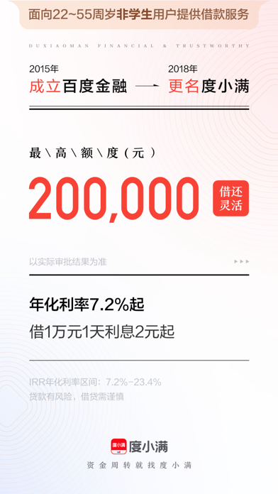 度小满是综合类金融服务平台,面向大众提供互联网信贷服务、优质的基金销售服务和安心的保险服务。度小满持有多种牌照,并与数百家银行,持牌金融机构达成合作,在信贷、理财、保险、支付等领域为用户提供值得信赖的金融服务。资金周转就找度小满! 【度小满 借钱】 度小满利用人工智能和大数据风控技术,为用户提供方便、快捷、安心的借款服务。 产品特点: 1.贷款额度高:最高额度 20万元; 2.息费透明:年化利率7.2%起,借1万元利息一天2元起,年化利率区间7.2%-24%; 3.操作便捷,借还灵活:在线申请,支持多种还款方式,最长可分12期慢慢还; 4.安全借款:个人信息全程加密,为您提供全程保护。 【理财】 甄选持牌金融机构,严格筛选金融产品,覆盖多种金融产品种类,满足不同期限、不同风险偏好的投资需求。 资金安全有保障:领先的研发技术团队,打造严密风控体系。 【保险】 精选保险产品:涵盖重疾险、医疗险、意外险、寿险、年金险、财产险,多方面保障服务; 1V1专属服务:资深保险经纪顾问一对一指导,测需求、做方案、挑产品,全流程贴心服务。 温馨提示: 借贷有风险,选择需谨慎。具体贷款利率、额度、期限以实际审批为准(年化利率区间7.2%-24%),资金来源:重庆度小满小额贷款有限公司及合作金融机构。 理财活动说明: 「新用户登录即享卡券好礼」小满专门为新用户提供了新手大礼包;您还可参与线上活动“解锁财富会员 领现金”,返现超快。活动自即日起至当期活动期满止,具体兑换规则可查询活动详情页面。 保险活动说明: 作为新用户,您有机会参加我们的「新人健康大礼包」活动!在保险页面,轻松点击“立即领取”按钮即可进入活动页面。此次活动为首次开通保险业务用户专属,让您的健康保障更加贴心。 在活动中,您将有机会获得至高88000元的健康保险保障金,一年内涵盖100种大病,让您的健康无忧。每日签到后可参与抽奖,中奖率100%,中奖后最低可增加10元保额,让您的健康保障更加完善。具体奖品信息及活动规则请以页面规则为准。【手机贷款】界面性能优化,操作体验更流畅! 【现金贷款】优化细节问题,操作服务更贴心!