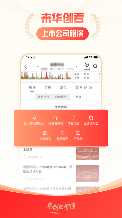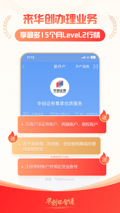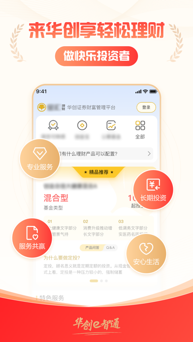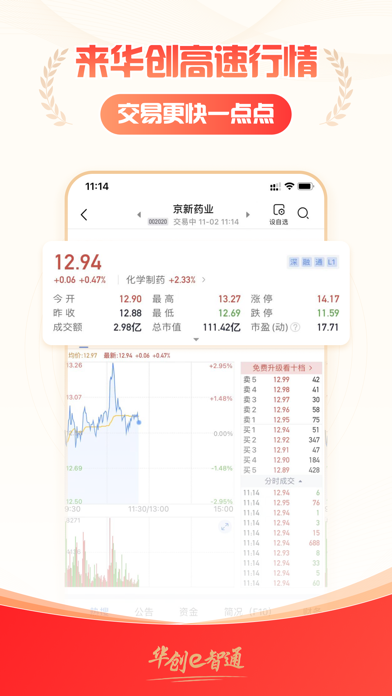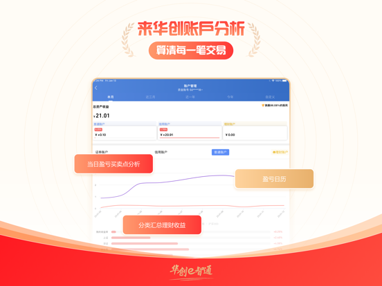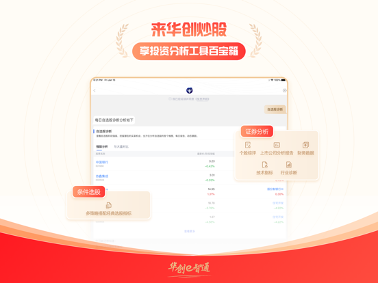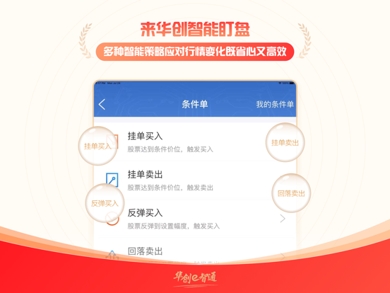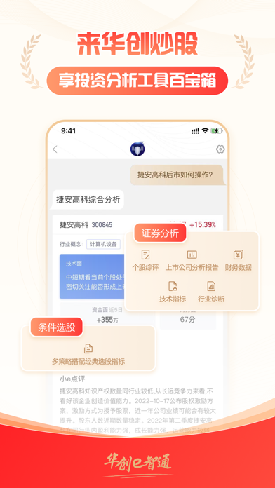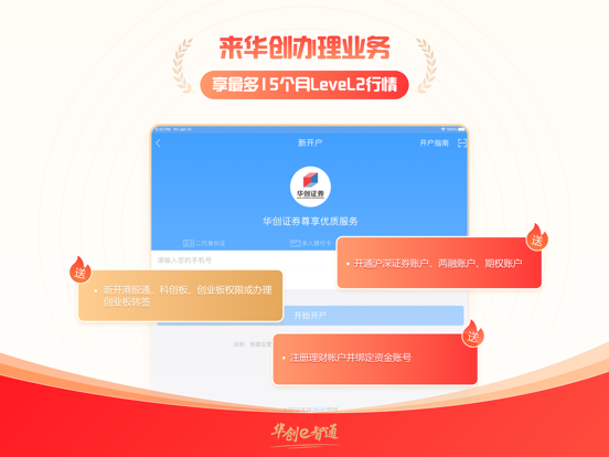华创e智通由华创证券出品,连续在券商中国、新浪财经等评选中荣获“最佳突破创新APP”“用户最喜爱APP”等20多个奖项,是一款值得客户信赖的投资理财软件。 【新客专享】 1、开通沪深证券、两融、期权账户,并在e智通首次登录帐户,分别赠送3个月Level-2行情使用券; 2、线上柜台新开港股通、科创板、创业板权限或办理创业板转签,分别赠送1个月Level-2行情使用券。 3、通过e智通注册金汇金融理财帐户并在金汇金融账户绑定华创证券资金账号,赠送3个月Level-2行情使用券; 4、开通金汇金融理财账户享专属新手理财。 所赠礼券支持叠加使用,最终解释权由华创证券所有。 【特色服务】 1、管理型基金投顾 专业的基金投顾团队接受客户委托,精选市场优质投资标的,全程管理基金投资组合,提供管家式服务,实时跟踪,自动调仓。 2、上市公司分析报告 对上市公司特征进行逻辑重构、重新构建分析方法和体系,围绕研究主体,从多个维度分析个股。 3、华创研究所 华创证券独家研究报告,每日要闻推送。 4、金汇金融 华创证券财富管理平台,理财产品种类丰富,含可转债、公募基金、私募基金、信托、资管、收益凭证。 5、六大维度两类信号 聚焦宏观、产业、焦点、基本面、资金面、技术面六个维度,分别生成积极信号和谨慎提示两类信号,立体式呈现上市公司基本情况。 【基础服务】 股票开户:股票、基金快速开户,无任何费用(开户前准备身份证、银行卡) 交易功能:新股新债申购、股票交易、融资融券、大宗交易、银证转账、委托撤单、交易明细等 交易品种:京沪深、北交所、沪港通、科创板、新三板、股票期权等 账户分析:全景账户分析,投资记录一览无余 智能小e:智能机器人投顾,覆盖海量问答,7×24小时在线服务 条件埋单:自主设定交易条件,计划交易更成功 【来自用户的评价】 @L-jinghan:非常好用的一款交易软件,新手很容易上手,功能也比较齐全,非常智能,华创证券服务也很好开户也很简便。 @Z-DT:第一点是非常稳定、流畅、兼容,不会出现一些APP的闪退、黑屏等情况;第二点是功能齐全丰富,满足基本交易需求,咨询等内容丰富,超越心理预期;第三是界面设计简单明了,菜单规划使用合理。 @黄玉钦钦:很好的一个炒股理财软件,我用了以后再也不想用其他的了,炒股理财必须选择这个。 --------使用中有任何问题或建议,请通过以下方式联系我们-------- 24小时智能客服:智能小e 服务热线:95513 华创证券官网:http://www.hczq.com/ 华创证券财管平台:https://www.jinhui365.com/1、科创板成长层行情交易改造 2、行情页新增“全部服务”菜单