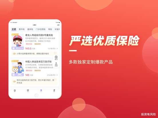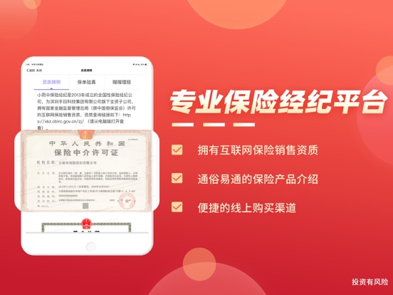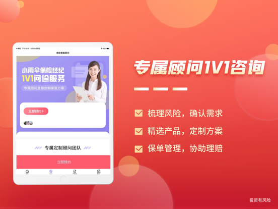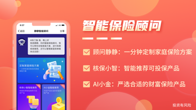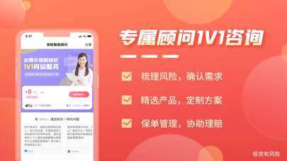 保险智能顾问是小雨伞旗下互联网保险经纪服务平台,由小雨伞独立研发,通过大数据分析、智能核保,为用户提供更加智能、便捷的保险服务。 【智能顾问】 1、智能顾问静静,一分钟快速定制家庭保险方案; 2、智能核保小智,快速根据疾病智能推荐可投保产品; 3、智能财富小金,为您严选合适的财富保险产品; 【专属顾问】 1、专属顾问量身定制,根据需求和实际情况定制家庭整体保险方案; 2、市面产品方案对比,针对您想了解的产品进行深度对比; 3、已有保单诊断,为您和家人进行已购买的保单进行全面的诊断分析; 【联系我们】 微信公众号:小雨伞(xysbaoxian) 公司网址:https://www.xiaoyusan.com/ 客服热线:400-919-7788(7*24小时)1、【新人福利】领166积分礼券,激活后可兑换话费、打车券! 2、【智能顾问静静】一分钟定制家庭保险方案; 3、【智能核保小智】快速根据疾病智能推荐可投保产品;