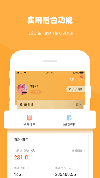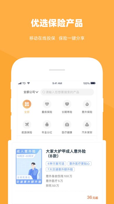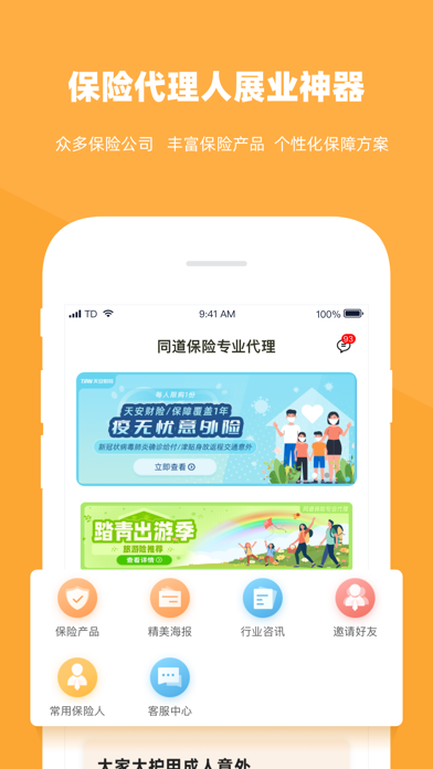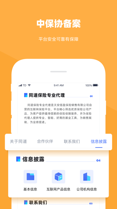 同道保险专业代理 同道,我们为你选对的保险 为互联网+保险而生! 精选保险产品,支持在线投保! 保险评测资讯,只选最合适的! 全国保险中介,全方位的支持! 【天安佰盈】 2015年8月,天安佰盈保险销售有限公司(简称“天安佰盈”)在北京注册成立,注册资本3亿元。公司控股股东为天安财险,其注册资本177.64亿元,连续3年保费收入位居财险公司前十。天安佰盈在全国范围内(港、澳、台除外)代理销售保险产品;代理相关保险业务的损失勘察和理 名类住 称赔。截止2018年底,天安佰盈已经成长为拥有万名员工、服务于数百万客户,32家省级分公司,200余家地市级分公司的专业保险中介机构。 【同道保险专业代理】 同道保险专业代理是天安佰盈旗下专业互联网保险平台。从保险名词、险种科普、理赔知识,到保险案例、产品解读、产品测评、带病投保等,同道保险专业代理均为保险代理人和用户提供专项的服务、专业的工具。无论是线上还是线下,同道保险专业代理都是保险代理人和用户值得信赖的保险保障服务平台,为大家带来真正的保险风控管理服务。我的页面-佣金优化