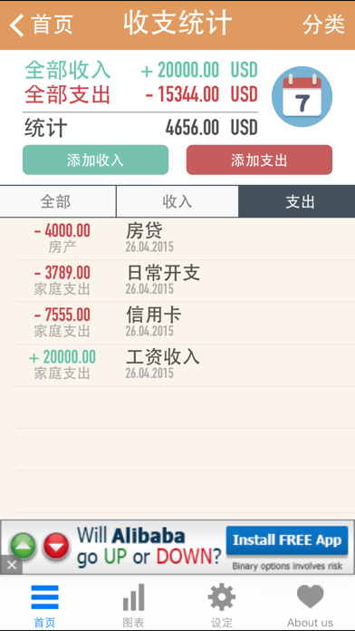 这是一个完全免费、简单便捷、好用的收入支出管理器,它可以随时随地地帮你记录你当前的收支平衡情况。 主要特点: - 界面简洁美观。 - 你可以随意添加自己的类别和子类别。 - 多帐户/多货币支持,每个帐户可以有不同的货币。 - 随时记录你的收入,费用和转帐交易,自动计算当前的收支平衡情况。 - 你可以设定密码保护。 - 内置最及时的汇率查询和转换功能,你可以任意选择你想要使用的货币单位。 - 具有提醒功能,你可以让应用在你设定的时间点提醒你交账单、还房贷等。 还犹豫什么呢?赶快下载使用,你的一切收支情况从此将变得清清楚楚,明明白白!Apple 已更新此 App 以显示 Apple Watch App 图标。 Fixed a small bug !