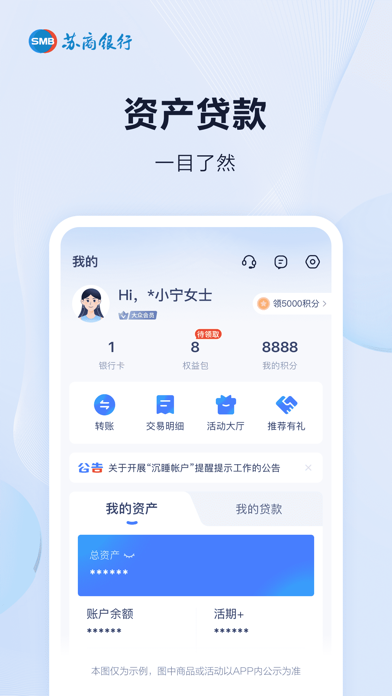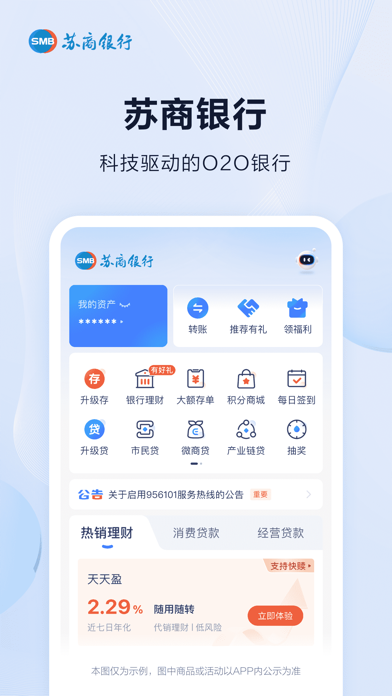 苏商银行成立于2017年6月,位于江苏南京,是中国银保监会批准成立的一家商业银行。定位于“科技驱动的O2O银行”,秉承“金融科技+场景金融=普惠金融”的经营逻辑,着力于服务实体经济,为小微、个人提供普惠金融服务。成立以来业务高速发展,已服务6000万个人客户和120万中小微企业客户。1、增加消息通知开通引导; 2、优化一键登录; 3、其他体验问题优化