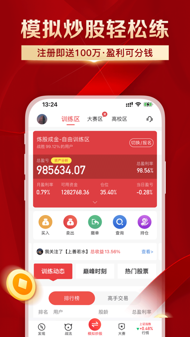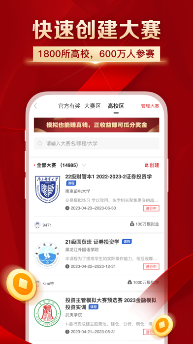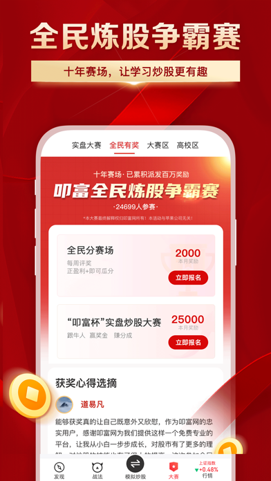 叩富简投是一款有全国影响力的专业模拟炒股大赛和智能炒股训练平台,自2006年创办至今已超过15年。免费创建大赛,免费参加各类丰富的有奖大赛,再通过跟牛人和量化智能训练工具,让学炒股变得更有趣,更简单。 叩富简投通过开发金融量化分析工具和超15年积累的民间炒股牛人资源,借助金融科技来解决炒股训练“费时、费力、费钱”的痛点,让用户在高仿真、无成本的环境下体验到“简捷投资”的乐趣。 1、跟牛人选牛股:全民炼股争霸赛、有奖大赛、实盘高手挑战赛,高手层出不穷,这些民间牛人的操作在模拟大赛中一键即可获取!解决新手投资者“怎么买”和“买什么”两大痛点问题。 2、叩富赛场:可以免费创建高校大赛、券商大赛和团队大赛。而且每月还有丰富的各类有奖模拟大赛,有趣刺激、每月都有万元大奖等你来拿!让练炒股更有趣,模拟也能赚到真奖金! 3、证券投资课程实练:是专门服务于高校的大学生金融课程实践平台; 4、知识中心:为各类水平的股民提供一个内容全面的视频学习资料库。 叩富简投已有超600万注册用户,在平台上开设模拟炒股大赛的团队或高校有1200多家,累积举办模拟炒股大赛超万场。叩富简投曾连续三年(2011年、2012年、2013年)承办腾讯“股动中国A股大赛”技术支持。 曾在2008年被上海证券交易所选为年度投资者教育专业训练网站。2011-2013年期间也为网易、中金在线举办的全国模拟炒股大赛提供技术支持。1. 优化用户体验 2. 修复已知BUG