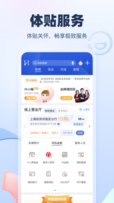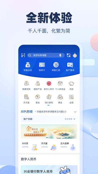 兴业银行手机银行6.0全新升级,享受智能“兴”生活: 【五大品牌】 五大品牌功能互通,手机银行为客户提供集团一站式金融服务。 【智能银行】 1.界面全新升级,千人千面展示定制化内容。 2.智能搜索,清晰易懂,智能识别搜索内容,榜单推荐热门服务产品,搜索卡片一键办理。 3.智能语音融入各业务场景,打造能听会说的手机银行。 【财富精选】 1. “财富”频道融合“钱大掌柜”。钱大掌柜作为兴业银行的财富管理统一品牌,秉承开放与专业的品牌理念,为您提供卓越体验,助力财富增值。 2.财富产品一应俱全,精选天天财富系列,丰富投资品类。 3. 财富账单为客户提供财富全产品、跨区间、全方位、多维度的盈亏分析和财富规划服务,辅助客户进行资产检视和再平衡,合理规划家庭投资、养老、子女教育、家庭保障和三笔钱整体配置。 4.投资生态圈实时为您提供资讯信息,投资动态一手掌握。 【体贴服务】 1.附近网点地图查找更直观,线上一键预约,线下直接办理,高效便捷。 2.“圈子”在线实时联系专属客户经理,线上工作室提供专业理财咨询等建议,线上营业厅预约线下网点服务“零距离”。 3.“安愉版”为老年客户定制大字、关怀版面,提供安愉人生一站式养老服务。 【安全便捷】 1.为客户提供安全、便捷的登录方式,支持微信、支付宝、AppleID等授权登录。 2.支持本机手机号认证服务,多场景无需手输短信验证码即可快捷完成安全验证。 3.智能风控反欺诈功能,结合交易环境、交易设备等因子,进行多样而精准的安全认证,兼顾客户体验与账户安全。改进用户体验,提高兼容性。