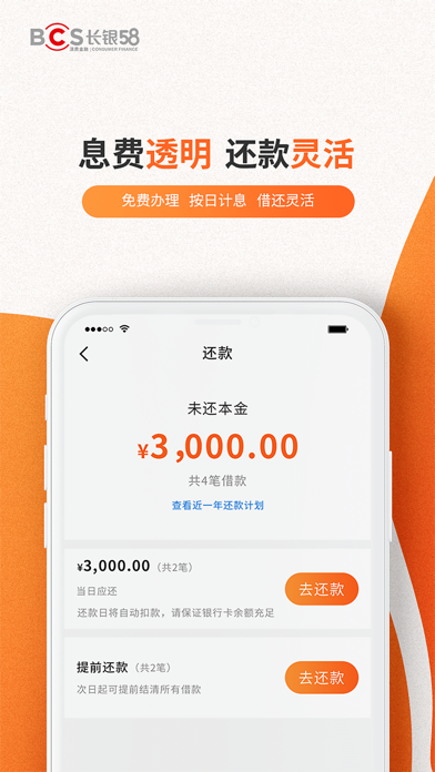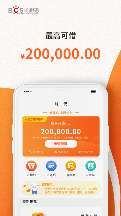 [产品介绍] 城一代是湖南长银五八消费金融股份有限公司推出的金融服务平台。长银五八消费贷是一款无抵押、免担保、可循环使用的个人消费贷款产品,助力城市奋斗者的梦想与追求,让城市生活更美好。[产品特点] 1.申请更简:在线免费申请,无手续费 2.门槛更低:纯信用,无抵押,额度最高20万 3.快速借款:审批通过后当天可用款,实时到账 4.利率普惠:借1万元每日利息3-6元,年利率(单利)10.8%-21.6% 5.借还灵活:循环使用,按日计息,不使用不收取费用 湖南长银五八消费金融股份有限公司是经国家金融监督管理总局(原中国银监会)批准设立的湖南持牌消费金融公司,由长沙银行股份有限公司、北京城市网邻信息技术有限公司、长沙通程控股股份有限公司共同发起设立,总部位于湖南长沙。官网地址 www.hncy58.com;微信公众号“长银58金融”。 [温馨提示] 湖南长银五八消费金融公司未与任何第三方融资中介机构合作,不收取任何中介费用,谨防上当。产品细节优化和部分已知问题修复