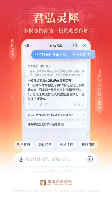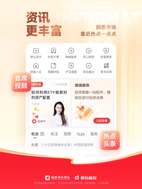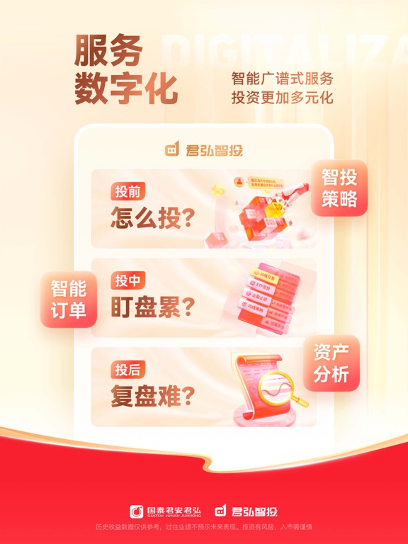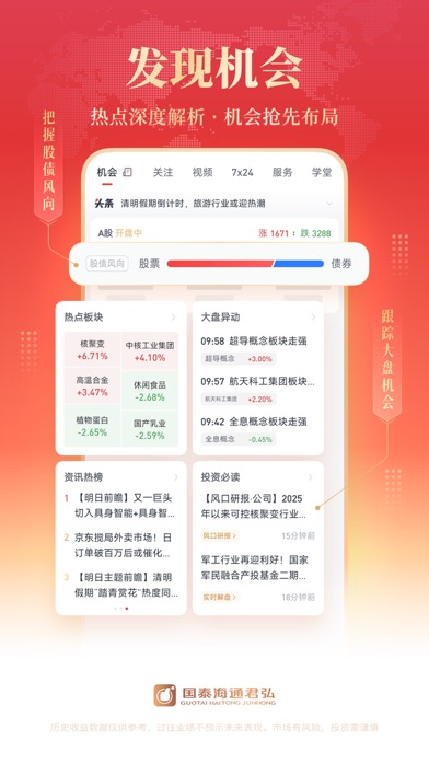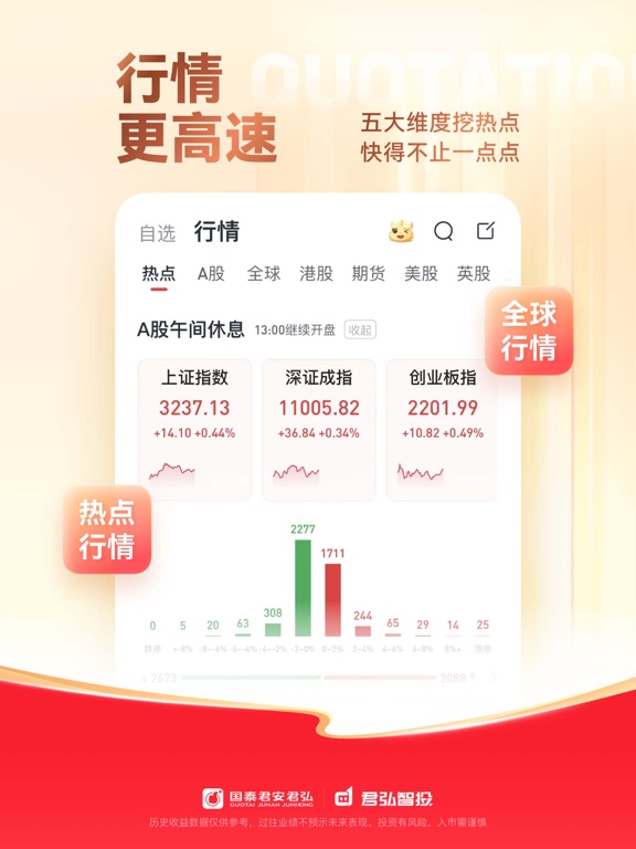 国泰海通君弘App是国泰海通证券倾力打造的一站式综合理财平台。由国泰海通证券自主研发,集闪速全球行情、场景化交易及账户、前沿人工智能、集萃理财商城和精选投资资讯等模块于一体。截至2025年6月,拥有用户超过6000万,获得权威大小奖项共100余项。 特色功能介绍: 【闪速全球行情】 1.行情速度稳居行业前列,刷新速度毫秒级响应; 2.Level-2 Plus还原真实委托单,深市更提供千档行情; 【场景交易/账户】 1.简单几步即完成交易,分时图也支持闪电下单; 2.智能打新可提前预约一周新股申购,360°全景账户打造专属投资对账单; 【前沿人工智能】 1.异动雷达智能盯盘,实时推送个股瞬息变化,解放盯盘双眼; 2.多空旗手联合筹码分布,经典策略挖掘个股,大数据解析个股表现; 【集萃理财商城】 1.新手理财、千款基金,总有一款产品适合您; 2.现金管家满足您闲置保证金在夜晚理财的需求; 【精选投资资讯】 1.专业研究报告精准推送,本土超强研究团队为您量身打造投资良策; 2.君弘在线,满满干货满足视听味蕾,告别书面资讯; 【新客享好礼】 新客户通过国泰海通君弘APP开立证券账户,可获得level-2行情月卡、形态大师三个月、新客理财券一张、盘中宝三个月、新手投教课。开户成功后,卡券将自动发放到对应的君弘APP上,限有效期内使用一次,活动长期有效。 更多详情,欢迎垂询国泰海通证券官方服务热线:95521。 【投资有风险,入市需谨慎】【优化】优化用户体验。