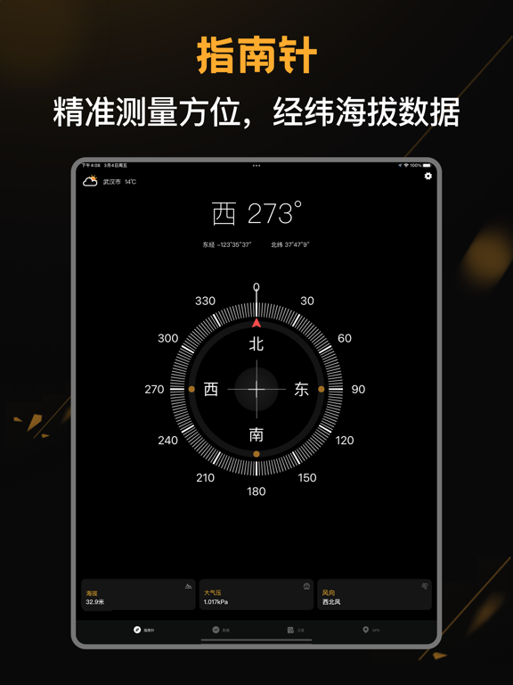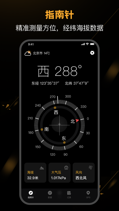 指南针,一款专业的指南针定位工具,利用网络和GPS、手机传感器等数据来确定您所在地的天气经纬度海拔等信息,同时支持实时显示GPS信息、GPS测速以及海拔高度,天气、气压、风向等实用信息,方便您更便捷的了解所处地理位置情况。 功能特性: - 根据定位信息,显示经纬度 海拔 天气等数据 - 支持风向、海拔记录等功能 - 支持GPS测速功能 - 支持相机拍照显示经纬度 获取订阅内容: 1. 获取全部精确地理数据 2. GPS测量速度次数不限 3. 经纬相机记录次数不限 4. 流畅无广告体验 * 我们的标准订阅选项为: 提供专业版订阅,包含连续包年的订阅,订阅会自动更新,期间可告别广告打扰;不限制使用所有功能,解锁所有专业版内容,优先享受功能更新。 * 在您确认购买时和每个续费周期开始时,我们会从您的 iTunes 账户中收取订阅费用。 包含免费试用期的订阅将自动续订为付费订阅。 在免费试用期结束前至少 24 小时,您可以在 iTunes 设置中取消您的订阅或免费试用。 取消订阅将会在当前订阅周期最后一天后生效,一旦取消订阅生效,您的订阅服务权限将失效。 隐私政策:https://docs.qq.com/doc/DUENpcFdPWVRiQnhQ 用户协议:https://docs.qq.com/doc/DUGZ5TGJjRnlzcmll1.优化数据显示效果 2.修复多个问题
