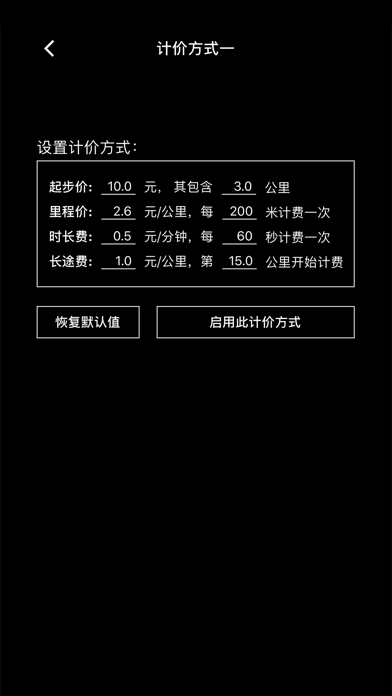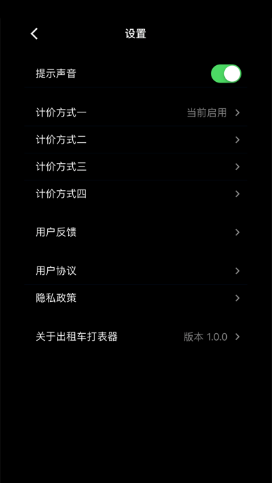 【简单好用】 模仿传统的出租车打表器,同时附加总里程数、总耗时,当前速度,及各费用明细等信息,界面简洁实用,一目了然。 【灵活设置】 可自定义每一项计费规则,最多同时保存4种自定义计价方式,根据自己的需要灵活设置,随意切换。1、修复小bug