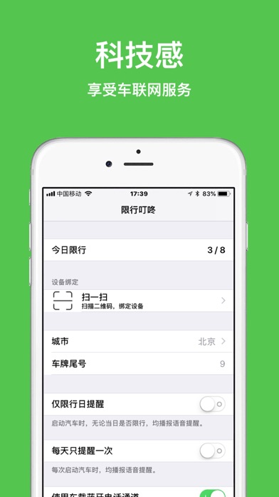 “限行叮咚”,是一款提供城市小客车尾号限行语音提醒服务的车载智能硬件,配合“限行叮咚”App使用,基于电子地理围栏技术,在驾驶员忘记限号即将驾车出行的关键时刻,提供更及时、有效的语音提醒服务。“限行叮咚”硬件设备外形小巧,轻便,USB接口。当启动汽车时, APP自动识别车载硬件,然后从云端获取当日限行尾号,并通过汽车音响或手机扬声器进行语音播报。 我们为什么需要“限行叮咚”? 现代都市生活,节奏飞快。很多人觉得自己似乎得了健忘症,即使手机已安装各式限行提醒的APP,仍然可能因为忘记限号驾车外出,而违章被罚。每日早晨或前日晚上的通知消息,日复一日,难以在您的脑海中留下深刻印象,这符合“边际效用递减”原理。遗忘是人类天性,健忘不是你的错,而是科技在生活服务方面做得还不够周到。“限行叮咚”在您上车时提醒,更及时、更有效。您的爱车里有了她,从此再也不必日日想着是否限行,再也不必为尾号限行的事儿而劳神了,以不超过一次违章罚款的价格,杜绝忘记限号的情况再次发生。于公,我们可以为缓解交通拥堵和环境污染,做出自己的一点贡献;于私,避免了违章罚款以及下年度的车辆保费上浮,并保持良好的个人征信记录。 - 修复了一些已知问题。