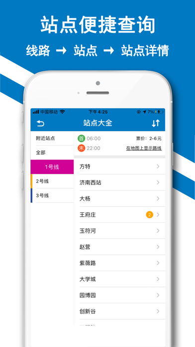 济南地铁通App,一款专业地铁出行智能助手。拥有2022济南最新地铁线路图,查询推荐最优换乘线路,最新站点信息全掌握(含周边)等地铁出行信息和功能。 ——【应用特色】—— 最新地铁线路:截止2022年,济南地铁共计开通1条线路:“1号线.2号线、3号线”,后续APP线路将更根据实际情况更新。 最优换乘线路:时时监控地铁运行状态(通畅或拥堵),查询推荐最优换乘线路,以及乘坐的时间,票价,距离。 便捷线路分享:支持线路查询结果,文本/图片保存到本地,或分享到第三方平台。 线路/站点收藏:换乘线路查询结果以及站点收藏。 详细站点信息:站点首末班车时间,车站服务设施(卫生间和电梯等)、出入口信息等。 ——【联系我们】—— 济南地铁App,接入济南地铁信息中心,所有信息仅供参考,产品处于开发阶段,可能存在部分未完善细节,欢迎广大用户反馈使用问题和给我们建议,我们会努力做最好的济南地铁出行助力。联系邮箱:app20190304@qq.com紧急修正济南地铁图加载错误。