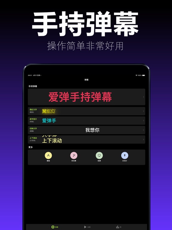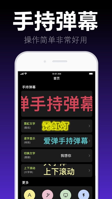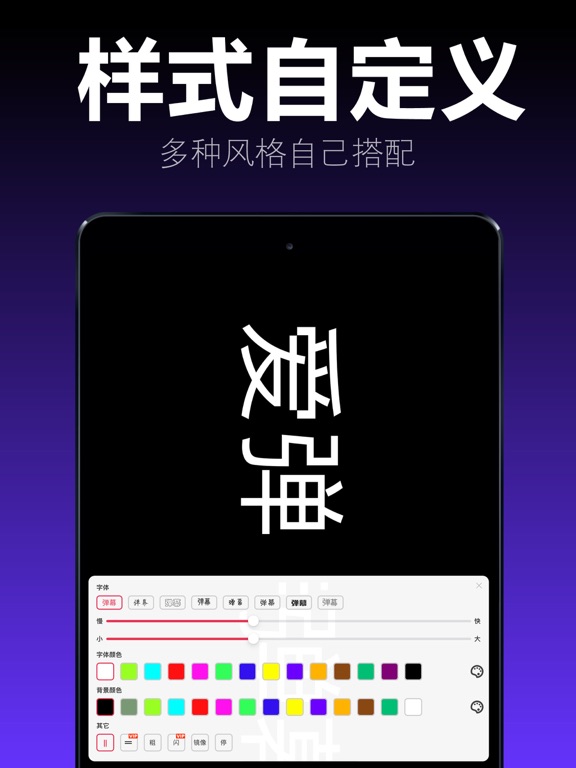 爱弹手持弹幕是简单、好用、强大的LED文字显示屏软件,内置多种字体特效。 只需要输入展示的文字,就可以获得非常酷的LED弹幕。 内置多种文字特效,包括:左右移动、上下移动、霓虹灯闪烁、大小切换等等。 爱弹手持弹幕可以在多种场景下使用,是生活娱乐的必备APP。 以下场景都可以使用: -喊话接人 -搭讪表白 -摆摊卖货 -信息展示 -现场加油 -祝福问候 内置多种场景模板,可以定义自己的文字。 爱玩的朋友们,快来试试吧! 只需输入文字,即可拥有超级酷炫的LED弹幕啦!1.修复iPad工具栏显示问题。 2.适配最新iOS系统。