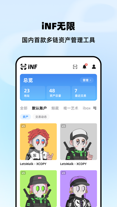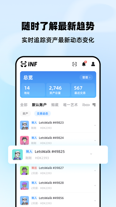 iNF无限是一款服务于中国Web3生态的多链资产管理应用,支持国内合规区块链Conflux树图链以及BSN联盟链。全面适配中国用户使用习惯,用户可跨平台管理链上资产,无门槛进入Web3。Web3统一授权服务为元宇宙和Web3开发者提供易于集成、合规、安全的统一授权解决方案。 ————————联系我们—————————— 公众号:iNF无限 邮箱:dev@inf.cool- 新增历史交易功能,一键查看资产交易 - 钱包交易动态优化,资产变化一目了然
