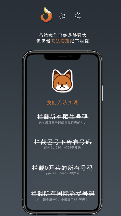 【功能特色】 1. 狐拒:自定义号段匹配规则,最多支持6位通配符 2. 狐云:基于大数据分析,一键拦截高频骚扰号段来电 3. 狐智:AI智能拦截,强力模式拦得多,普通模式拦得准 4. 基于已知号码库的境外号码拦截功能(BETA)已开启 5. 号码白名单,一键导入通讯录,重要来电不再被拒 6. iCloud自动同步,自定义号段云端存储,换机无忧 【使用限制】 1. 重要的事情只说一遍,不能拦截所有陌生号码,不能拦截区号下的所有号码,不能拦所有国际号码! 2. 因系统来电阻止功能组件限制,自定义号段拦截号码数上限为200万个,通配符个数限制在6位及以下,因此不支持自定义区号的号段拦截。 3. 因国际号码不确定性因素较多,号段规律性较差,对于国际号码(非+86)、香港(+852)、澳门(+853)、台湾(+886)的来电受通配符个数限制无法按照号段拦截。狐智AI中提供的境外号码拦截功能(BETA),是基于已知号码库实现的拦截,能够提供一定的拦截效果,但不能拦截所有国际号码。 4. 狐云大数据的“拦截XX开头号段”,为基于大数据收录的高频骚扰号段区域分类,并非将XX开头号码完全拦截。狐云列表中所有项目均可点击查看其具体拦截内容,已收录号段范围中的号码将会被拦截,未收录的则不会拦截。其中的高频骚扰号段、国际号码实际拦截效果依赖于用户的不断提交和对大数据的持续分析,您可以通过「号码提交」功能来帮助更多用户识别和自动拦截。 5. 狐智AI拦截的强力模式可大幅提高骚扰号码拦截率,但可能存在号码误判漏接,包括但不限于运营商、银行、快递、外卖员等电话号码,您可以切换到狐智AI拦截的普通模式,或使用号码白名单功能来避免拦截。 【技术支持】 软件中「使用帮助」页面已对您使用过程中可能遇到的问题进行了详尽说明,如果您在使用过程中还有其它问题,欢迎与我们的技术支持人员联系QQ3412469405,或点击软件中的「使用帮助」-「联系客服」按钮,我们将竭诚为您提供帮助。 【如何退款】 如拒之还不能满足您的要求,您可以在软件中点击「使用帮助」-「如何退款」下的链接,按照步骤申请针对应用的退款。根据Apple政策,通过AppleStore购买的应用付款由苹果商店控制和管理,我们无法对退款申请进行任何操作。通常情况下刚购买的应用会很快完成退款处理,请您耐心等待。如果您在使用一段时间后再申请退款,退款申请通常会被拒绝,请您在购买软件后尽快试用,如不满足您的需求请及早办理退款。 【内购项目】 1. 项目名称:6包野果(6元)、12包野果(12元)、30包野果(30元)、698包野果(698元) 2. 项目类型:消耗型项目 3. 项目说明:当您首次购买安装拒之App后,您已可以永久使用拒之的全部功能。如果您觉得我们做的好,可以在「支持我们」中通过内购项目来给我们鼓励,您的支持是拒之前行的动力。 4. 温馨提示:内购项目为消耗消费,1包野果为1元,购买成功后无法退款,请您适度鼓励、理性消费。 【隐私政策】 1.「拒之」采用iOS原生支持的来电阻止框架开发,不会主动收集您的任何信息。 2.「拒之自定义」中的拦截规则、拦截号码均由您自主设定。 3.「狐云大数据」、「狐智AI拦截」在使用时需要请求网络权限以获取后台数据,但不会收集您的个人信息。 4.「iCloud自动同步」功能使用iOS提供的用户个人隐私空间存储您的号段和设置数据,与您的AppleID绑定,他人无权访问。 5. 如果您自愿使用「号码提交」功能向我们提交号码样本,则仅会收集您提交的号码数据,此外不会上传其他任何信息,如果您自愿提交号码样本,则表示您同意开发者以任意方式处理该样本,包括但不限于进行大数据分析、共享给其他用户作为拦截号段参考等。【更新内容】 1. 接入香港官方骚扰号码库,境外号码拦截能力大幅提升 2. 更新狐智AI模型,新学习了近期的号码样本,新增16、17开头号码10W+,新增国家反诈数据库23W+ 3. 修复部分情况下白名单通讯录导入异常的问题 4. 修复部分情况下冲突检测异常的问题