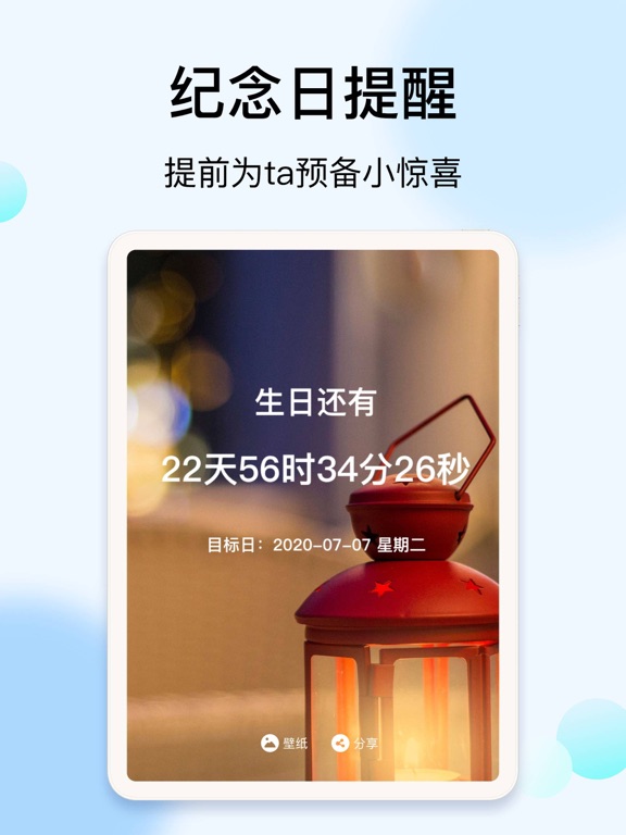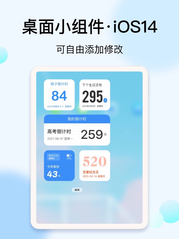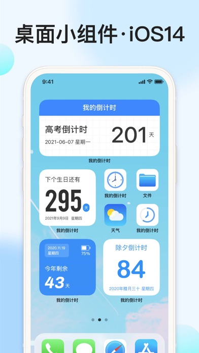 我的倒计时是一款免费且功能强大的时间记录提醒工具。 iOS14已支持精美的倒计时桌面小组件,锁屏倒计时,请注意更新~ 可用于记录:考试倒计时、生日提醒、节假日倒计时、各种纪念日、情侣恋爱天数、单身天数、生命倒计时等等。 让您不再错过生命中的每一个重要日子。 ===特色功能=== 1、两种主题风格:全屏、简约,满足不同喜好。 2、大量高清图片,动态壁纸,滤镜效果,让倒计时更美观 3、支持3种提醒方式:按周期定时提醒、提前提醒、重要日子提醒。支持置顶事件图标小圆点,不错过每个重要日子。 4、支持App内录屏保存,分享到短视频平台,个性化表达您的心情。 5、iOS14添加精美的桌面小组件,设置精美桌面主题。 6、iOS14.3以上系统支持锁屏倒计时。 7、支持数据备份,更换手机更方便。 您的支持是我们改进的动力! QQ交流反馈群:782815038fix bugs